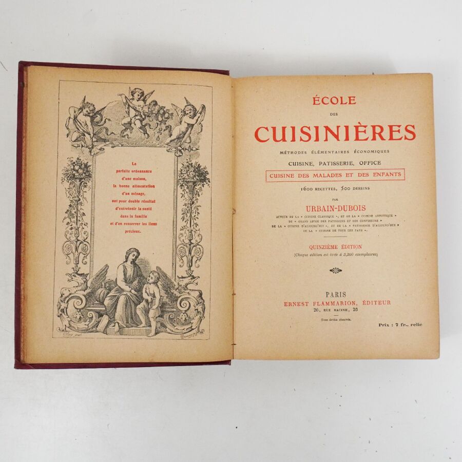 DUBOIS (Urbain), École des Cuisinières. Méthodes élémentaires économiques. Cuisine, pâtisserie, office. Cuisine des malades et des enfants. 1600 recettes, 500 dessins. [...] Quinzième édition. Paris, Flammarion, sd.