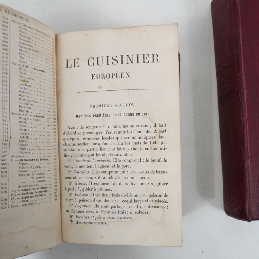 On y joint : BRETEUIL (J.), Le Cuisinier européen. Slnd. Petit in-8 cartonnage toile brique, titre doré (rel. post.). 175 figures gravées dans le texte. Manque le f. titre, mouillures claires, rousseurs par endroits.