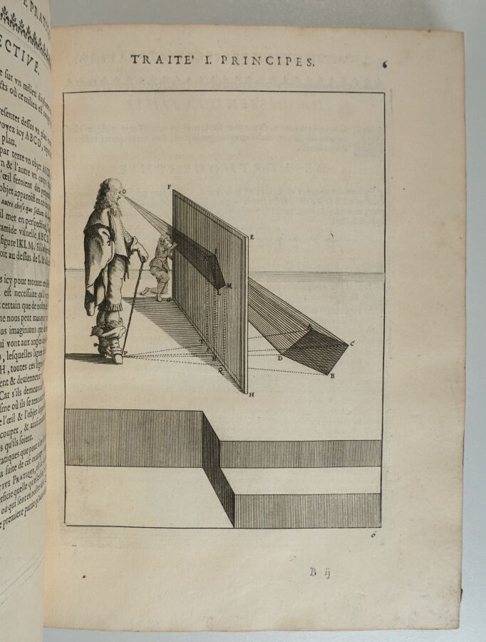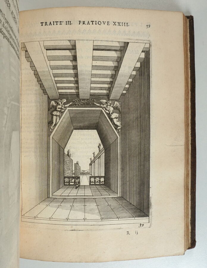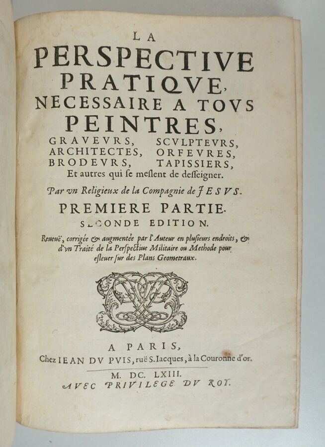 [DUBREUIL (Jean)] - La perspective pratique, nécessaire à tous peintres, graveurs, architectes, brodeurs, sculpteurs, orfèvres, tapissiers, et autres qui se meslent d'enseigner. Par un religieux de la Compagnie de Jésus - Paris ; Jean du Puis, 1663 - 2 volumes In-4° (sur 3, ici tome II absent) - 1 auréole marginale à quelques feuillets in fine du tome I - Bandeaux, grandes lettrines, culs-de-lampe, 2 frontispices gravés, 173 (2 planches 36) et 123 planches gravées hors texte (soit 296 planches sur 460 que comporte l'ouvrage au complet) - Reliure de l'époque veau brun granité (plats frottés, fentes partielles aux mors du tome I) - Dos à nerfs ornés, titrés et tomés or (coiffes élimées, nerfs frottés) - Tranches mouchetées de rouge - Bon exemplaire en 2nde édition.