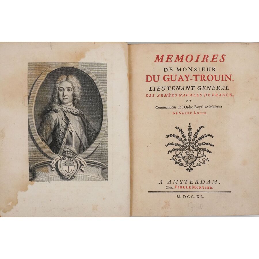 DUGUAY-TROUIN (René). Mémoires de Monsieur Du Guay-Trouin, Lieutenant-général des armées navales de France et commandeur dans l'ordre royal & militaire de Saint Louis. sl, sn, 1740. Amsterdam, Pierre Mortier, 1740. In-4 de [2] ff., xl-284 pp. Sans les 40 (xl) ff. liminaires, veau marbré ép., dos à nerfs orné (reliure de l'époque). Coiffes, mors et coins usés. Papier légt bruni.