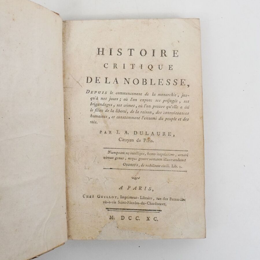 DULAURE (Jacques-Antoine). Histoire critique de la noblesse, depuis le commencement de la monarchie jusqu'à nos jours où l'on expose ses préjugés, ses brigandages, ses crimes, où l'on prouve qu'elle a été le fléau de la liberté, de la raison, des connoissances humaines et constamment l'ennemi du peuple et des rois. Paris, Guillot, 1790. In-8 demi-vélin ivoire à coins, titre manuscrit post. au dos (reliure de l'époque). Mouillures claires par endroits.