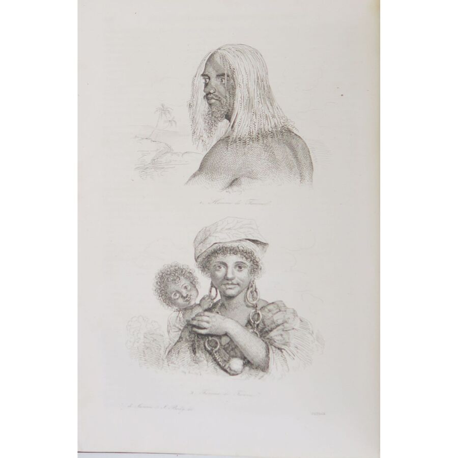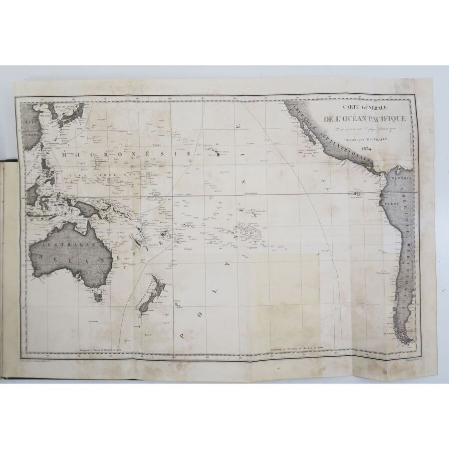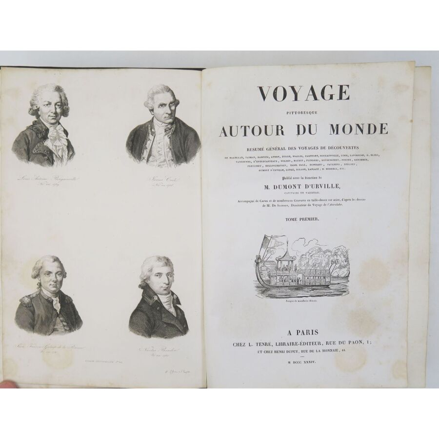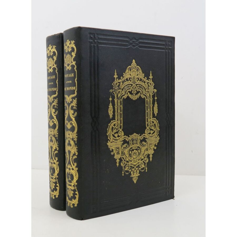 DUMONT-DURVILLE (Jules Sébastien César). Voyage pittoresque autour du monde. Résumé général des voyages de découvertes de Magellan, Tasman, Dampier, Anson, Byron, Wallis, Bougainville, Cook, Lapérouse, Bligh, Vancouver, D'Entrecasteaux, Wilson, Baudin, Krusenstern, Forter, Kotzbuk, Freycinet, Bellinghausen, Basil Hall, Duperrey, Paulding, Beechey, Dumont d'Urville, Lutke, Dillon, Laplace, Morrell, etc. Paris, Tenré, 1834-1835. 2 vol. in-4, chagrin bleu nuit, dos lisses richement ornés, plats ornés d'un triple filet à froid entrelaçé d'encadrement et grandes compositions dorées en leur centre avec le supralibris de Ch. Chalamet au plat supérieur du tome 1, tr. dorées (reliure de Boutigny).