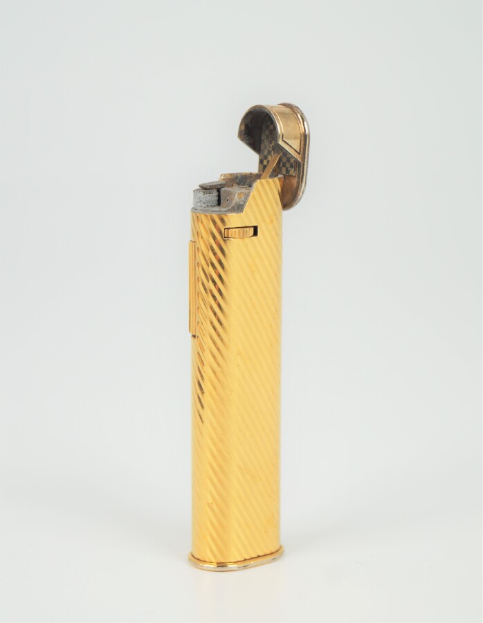 DUNHILL : Elégant briquet en métal doré à décor de petites côtes torses, présenté dans son écrin d'origine, H. 7.3 cm.