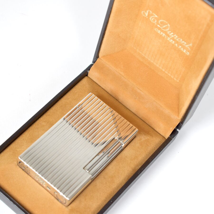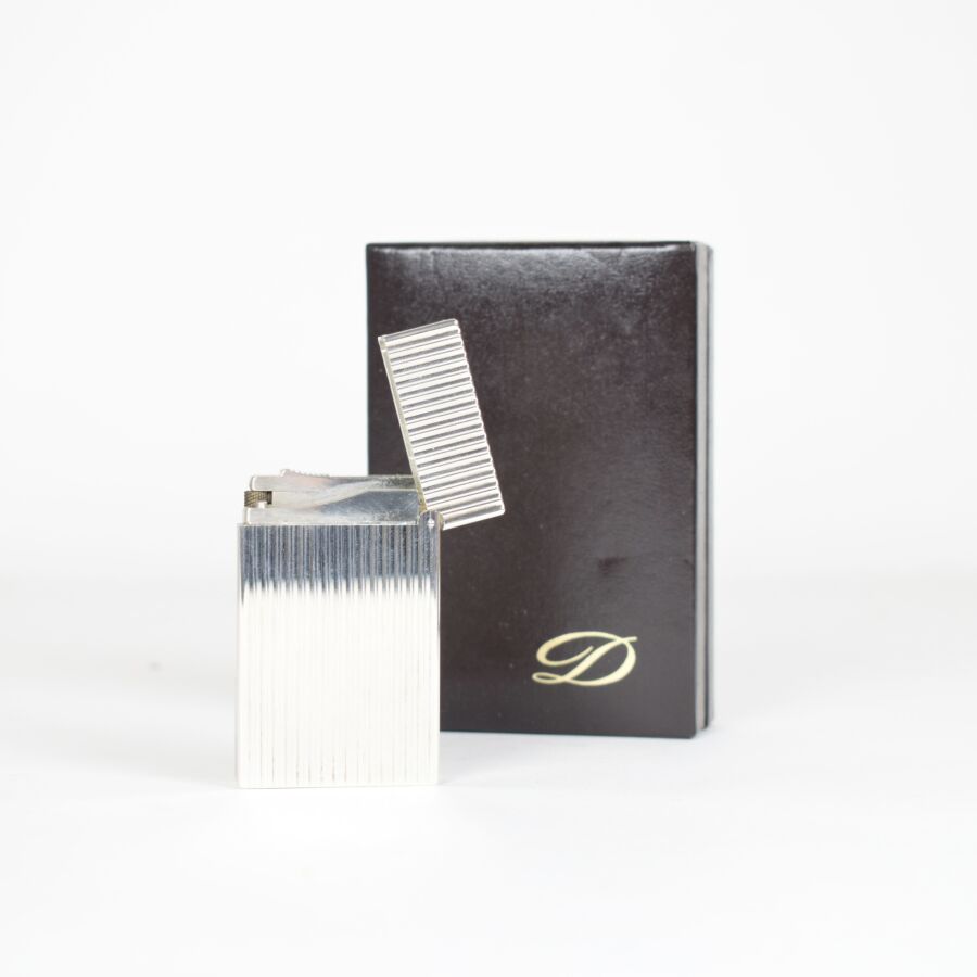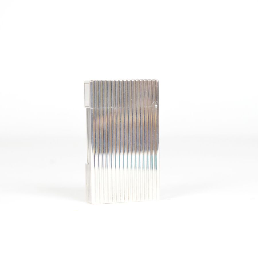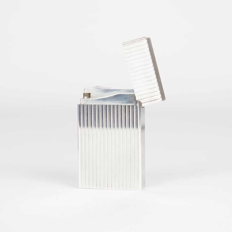 DUPONT : Briquet en métal argenté à décor de godrons, (usures à l'argenture, petits chocs), L. 3.5 cm, H. 6 cm