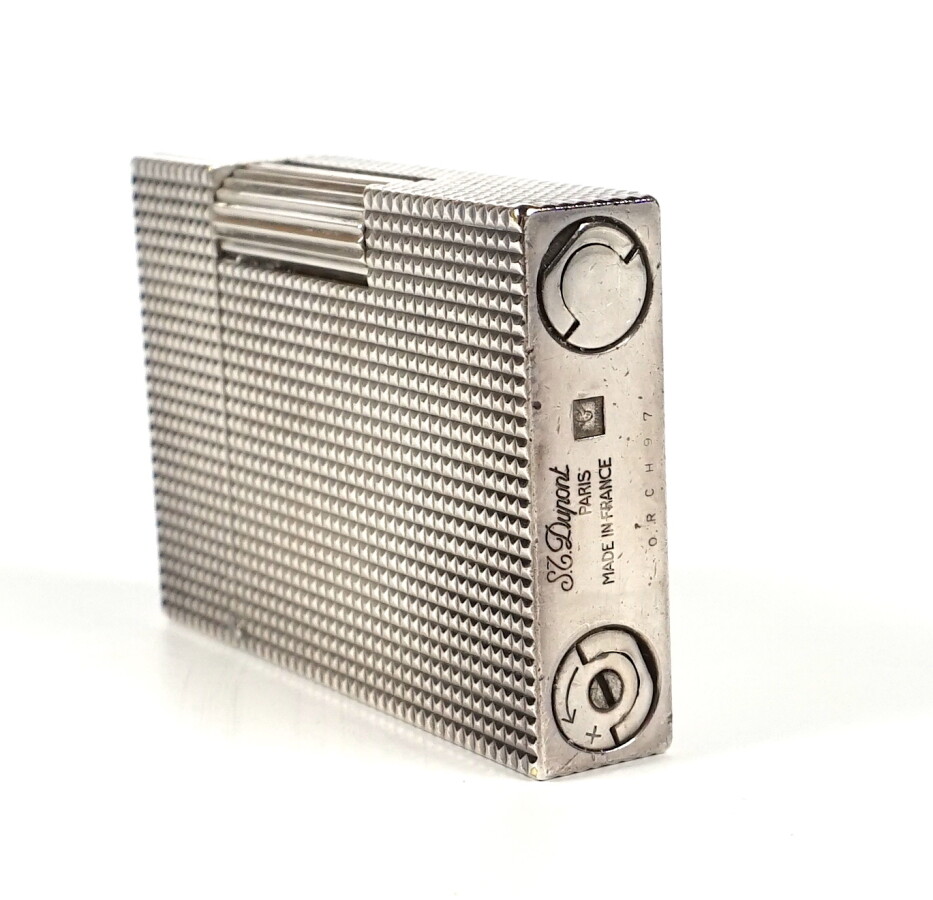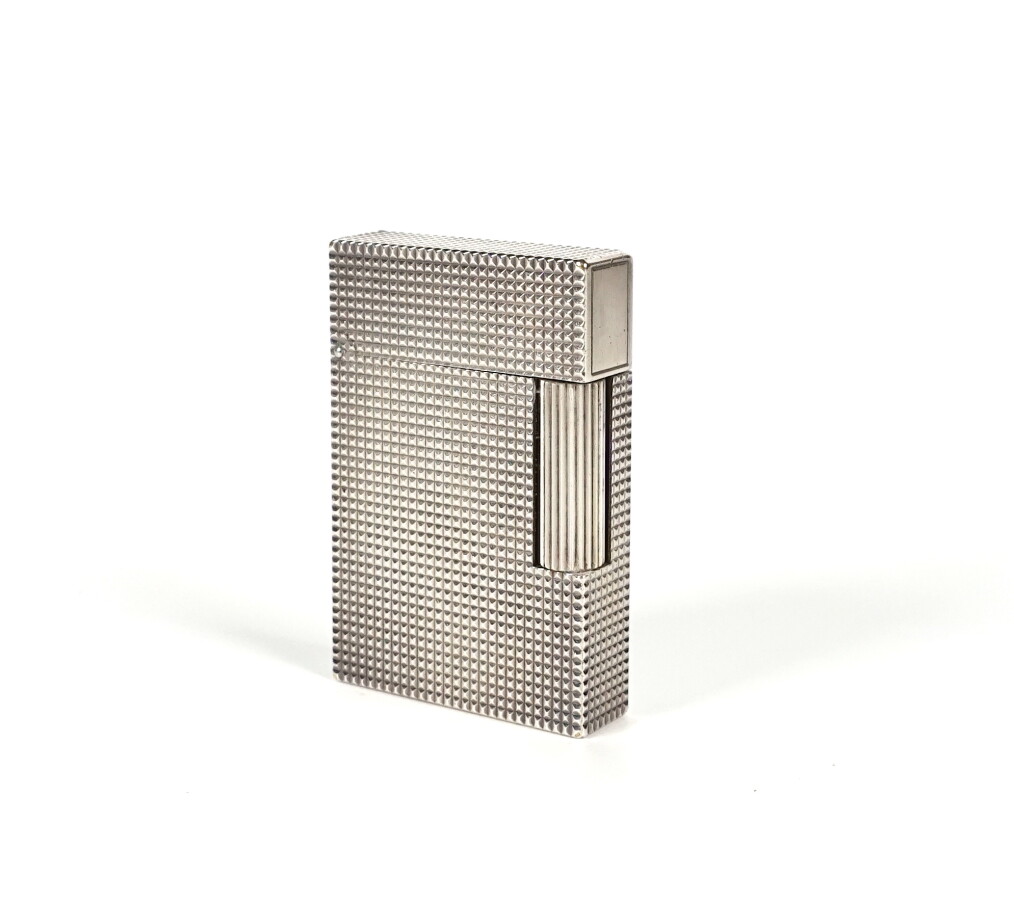 DUPONT : Briquet en métal argenté à décor de pointe de diamants, numéroté ORCH 97, H. 5.5 cm.