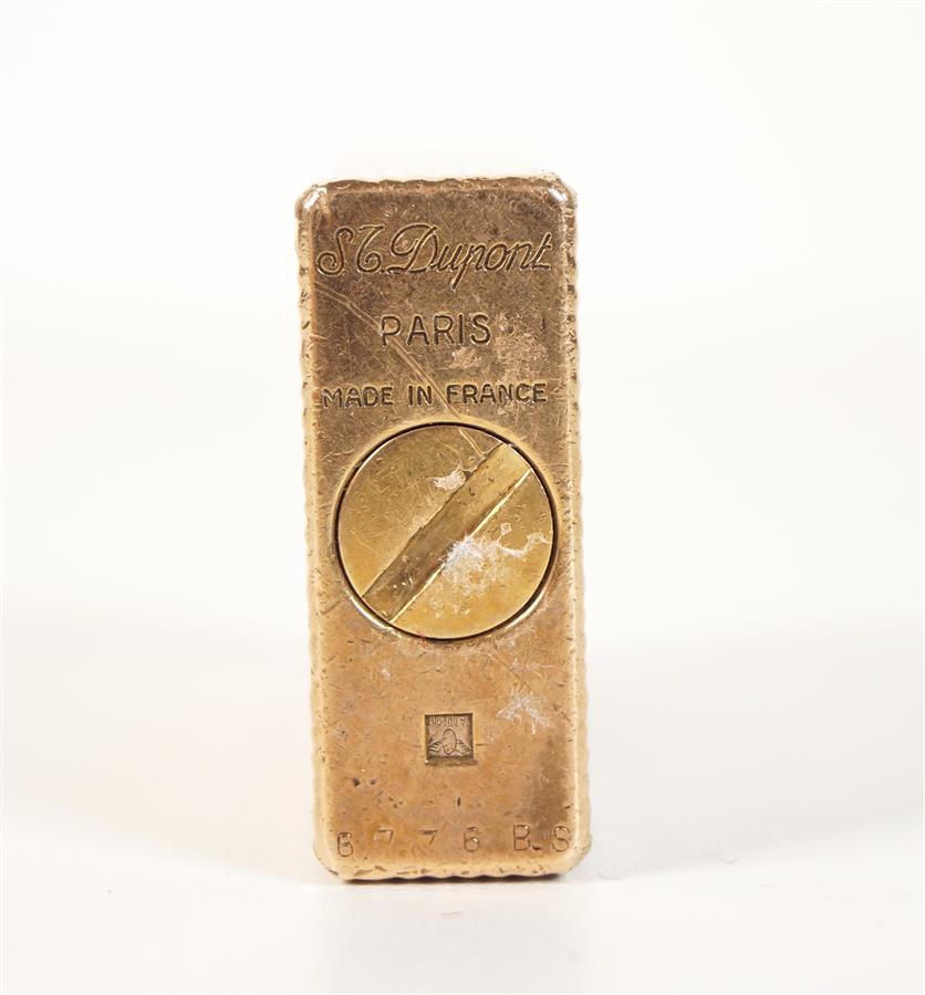 DUPONT : Briquet en métal doré, à décor de rainures, signé et numéroté, H. 6 cm (en l'état).