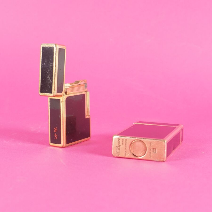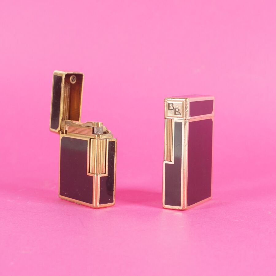 DUPONT : Deux briquets, métal doré et laque de Chine noire, marqués et numérotés dessous, l'un monogrammé "BB", H. 4.7 cm et 5.8 cm (quelques usures).