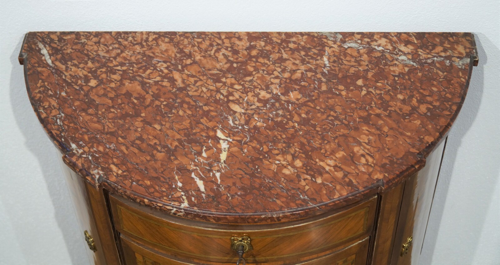 è-Petite commode demi lune de style Louis XVI en bois de placage, à décor marqueté de bouquets de fleurs et noeuds de ruban, elle ouvre à 3 tiroirs en façade dont deux sans traverse, et 2 petits vantaux latéraux, 4 pieds fuselés, ornementation de bronzes dorés, plateau de marbre griotte, H 87.5 cm (avec une clé, deux tiroirs bloqués fermés).