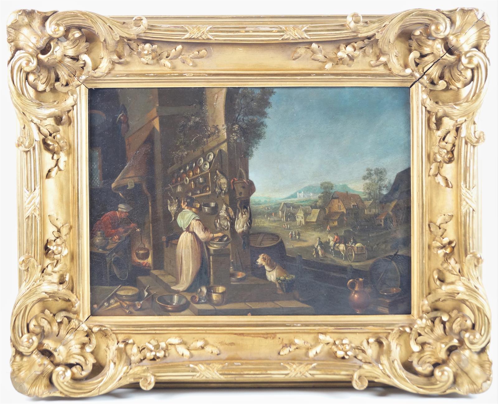 Ecole allemande du 18e siècle, suiveur des BASSANO, "Scène de cuisine ouverte sur un village", cuivre, 27 x 38,5 cm (petits manques et restaurations anciennes).
