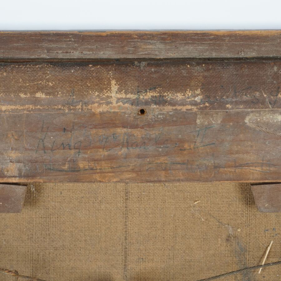 École anglaise de la fin du 17ème - début du 18ème siècle, "Portrait présumé de Charles II", huile sur toile non signée, mentions manuscrites au dos du châssis et envoi "Pour Monsieur Maurice Chevalier, with the very Kindest wishes and thoughts", 36 x 31.5 cm (craquelures et petites traces).