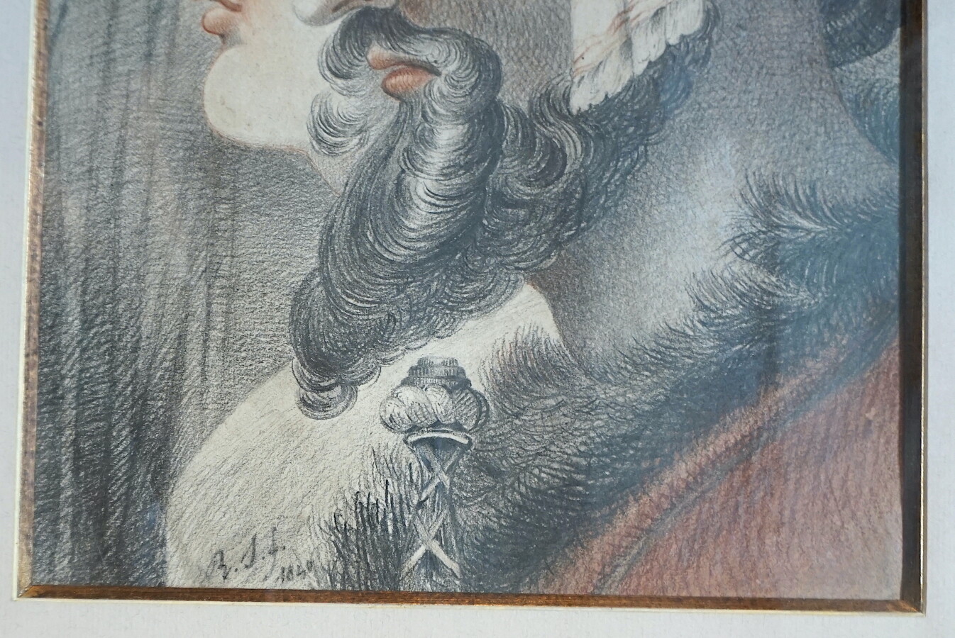 Ecole anglaise du 19ème siècle, "Portrait d'acteurs de théâtre de profil" 1840, pierre noire et sanguine, monogrammé et daté "R.S.F. 1840" en bas à gauche, 36.3 x 24.8 cm.