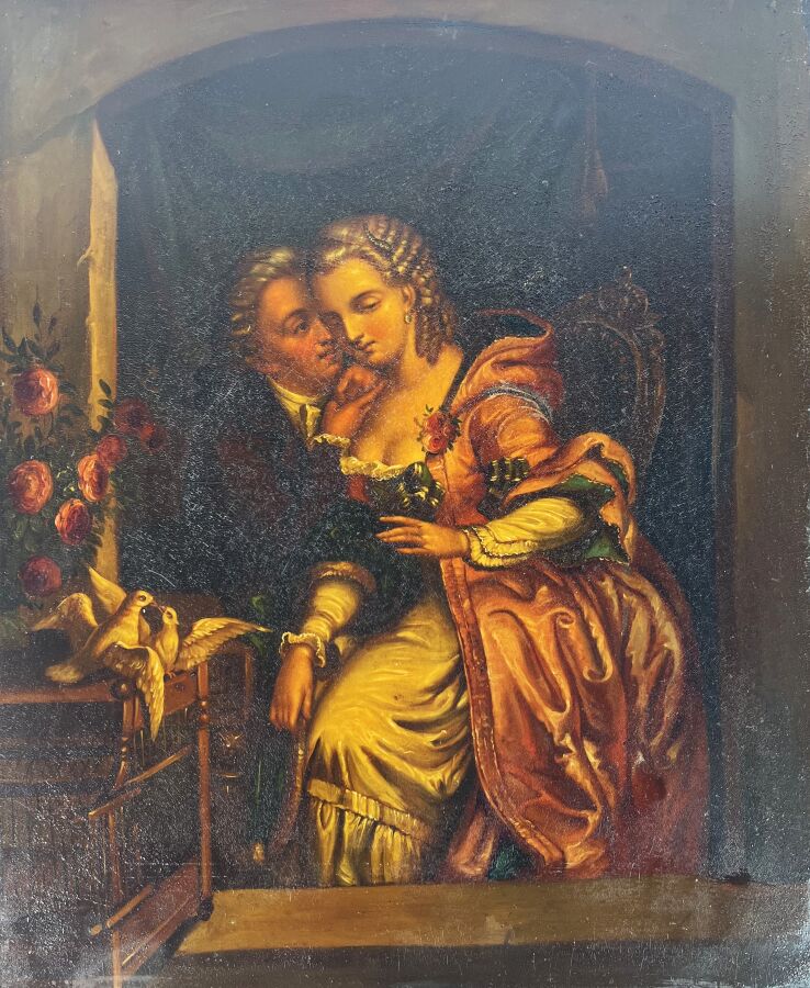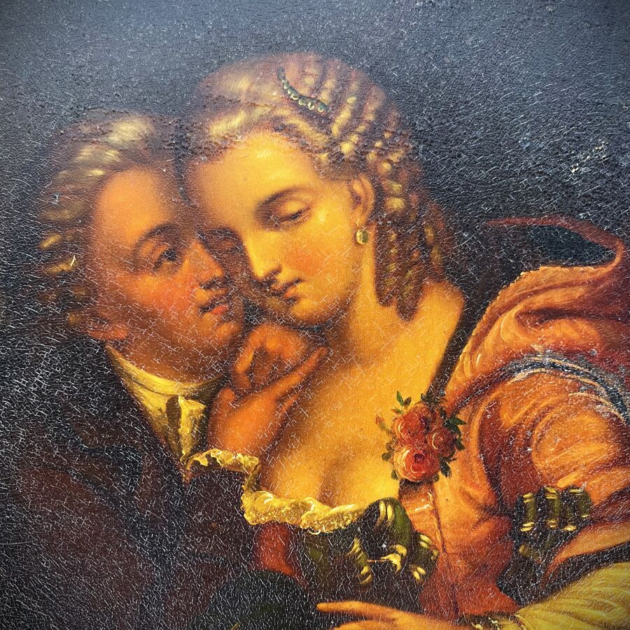 Ecole anglaise du 19ème siècle, "Scène galante", huile sur plaque de métal, non signée, dans le goût du 18ème siècle, 38.5 x 32 cm (craquelures).