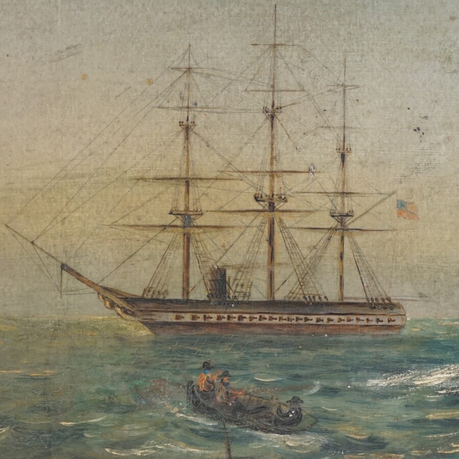 Ecole anglaise du début du 19ème siècle, "Trois-mâts armé devant une côte", huile sur carton, trace de signature en bas à droite, 20 x 26 cm.