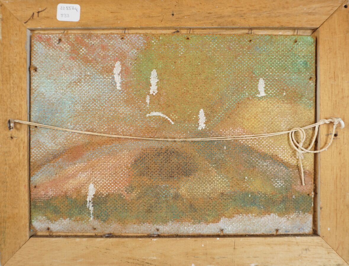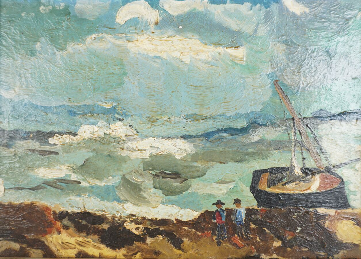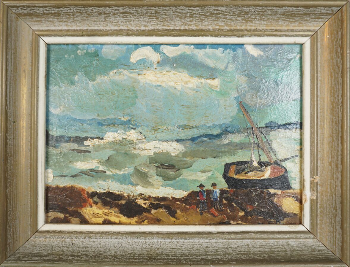 Ecole bretonne du 20ème siècle, "Voilier en bord de mer", huile sur isorel, signature difficilement lisible en bas à droite, 19 x 27 cm.