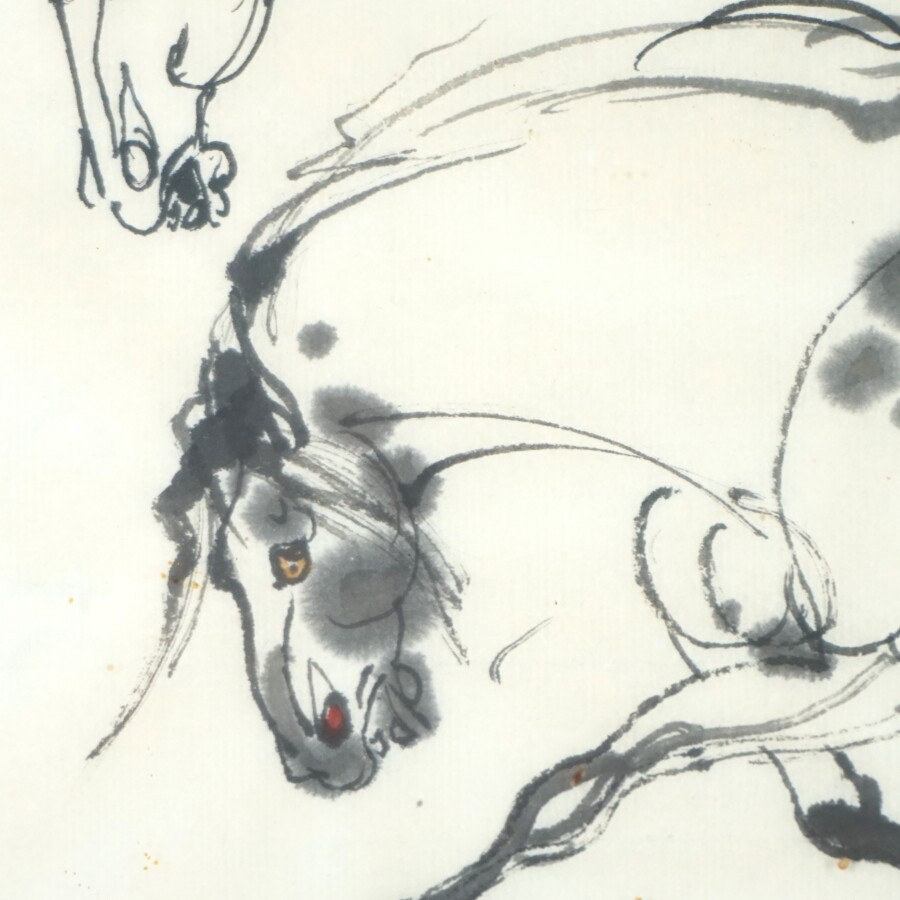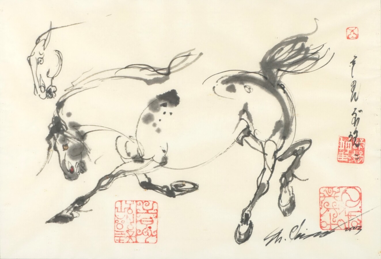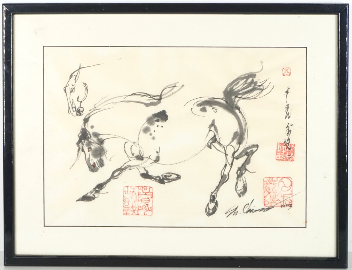 Ecole chinoise moderne, "Cheval en mouvement", encre sur papier, porte un cachet et une signature, 21.5 x 31 cm.