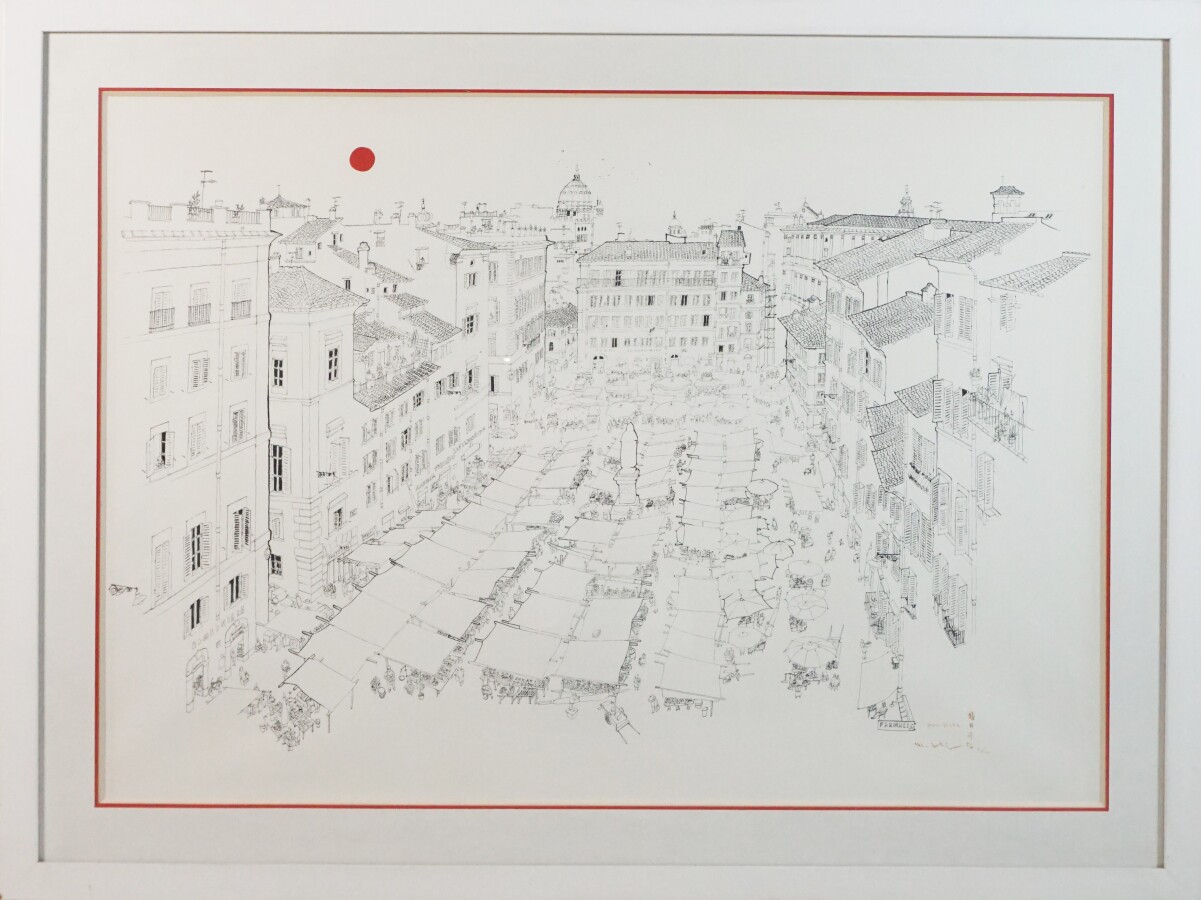 Ecole contemporaine, "Italie, la place animée", estampe sur papier, porte une signature et une dédicace en bas à droite et numérotée 2/100 dans la marge, 73 x 103.5 cm (à vue).