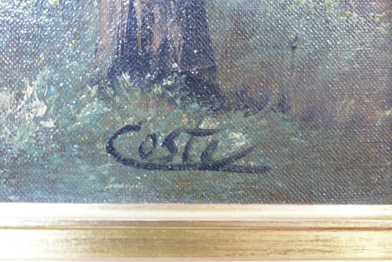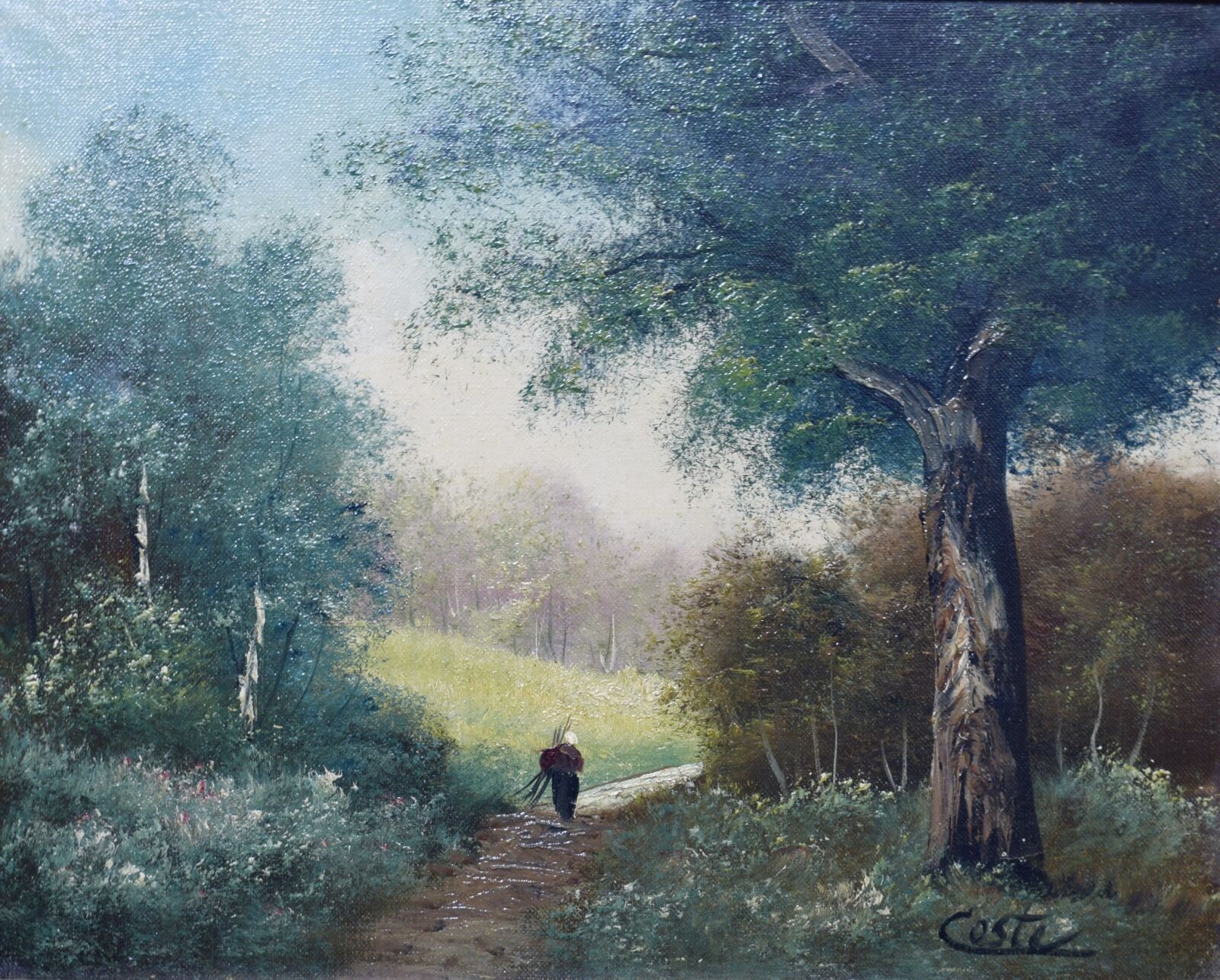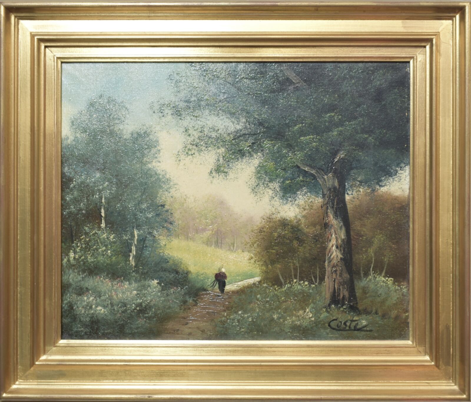 École de Barbizon, "Paysanne ramassant du bois", huile sur toile, signée en bas à droite, 32 x 40 cm. (manques)