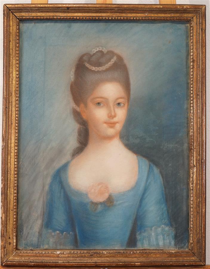 Ecole de la fin du 18e siècle, "Portrait d'une jeune fille au collier de perles dans les cheveux", pastel sur papier, cadre d'époque Louis XVI, 58 x 36 cm (à vue)