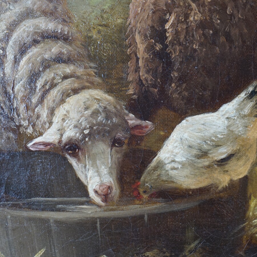 Ecole de la fin du 19e-début du 20e siècle, "Brebis et poules à l'étable", huile sur toile, signée "Montplon" (?) en bas à droite, 65 x 49 cm (petits éclats de peinture et frottements).