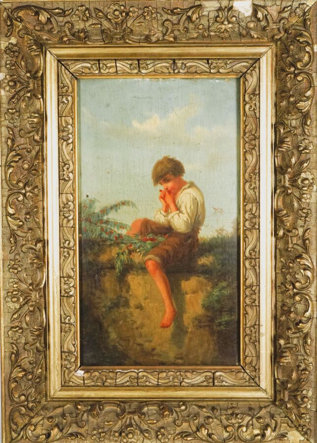 Ecole de la fin du 19ème siècle, "Jeune homme sur le mur", huile sur panneau non signée, 30 x 17 cm.