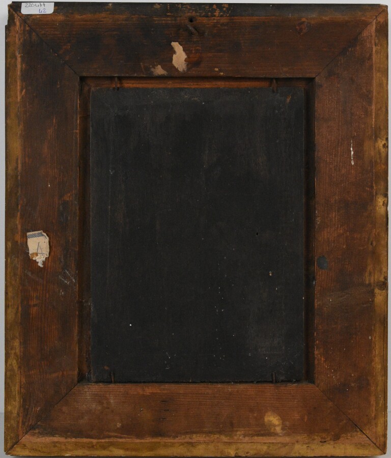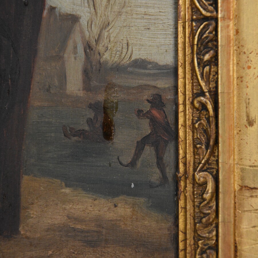 Ecole du 19e siècle, "Le repas", huile sur panneau non signée, 21 x 15 cm (craquelures, traces de colle).