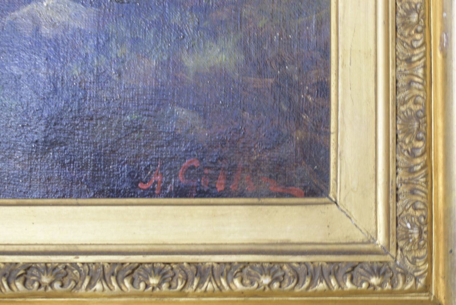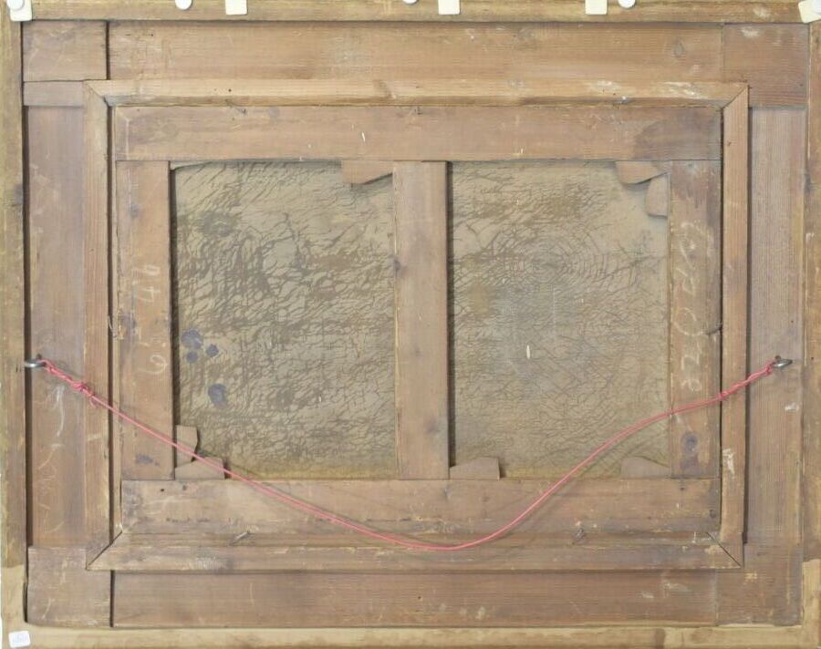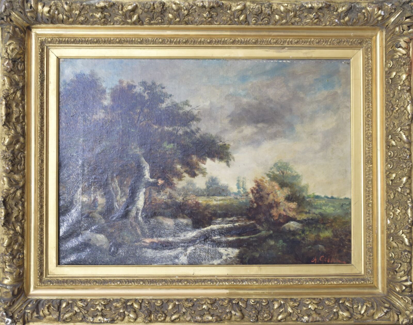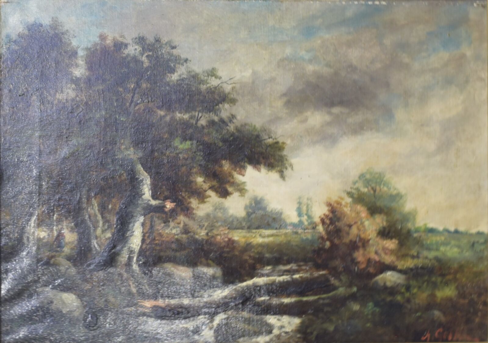 École du 19e siècle, "Sous-bois au ciel orageux", huile sur toile, 46 x 65 cm. (craquelures, manques et voilage)