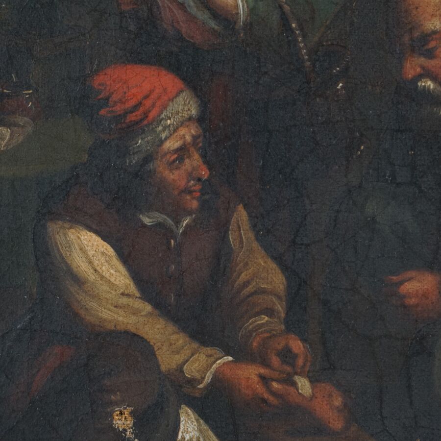 Ecole du 19ème siècle, dans le goût de TENIERS, "Scène d'intérieur", huile sur toile non signée, 25 x 21 cm (deux accrocs à la toile).