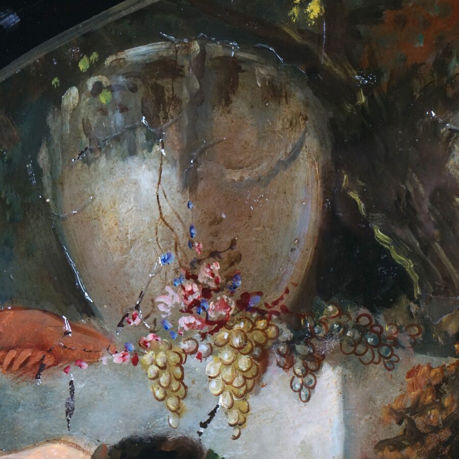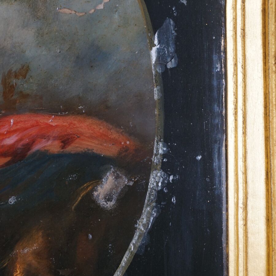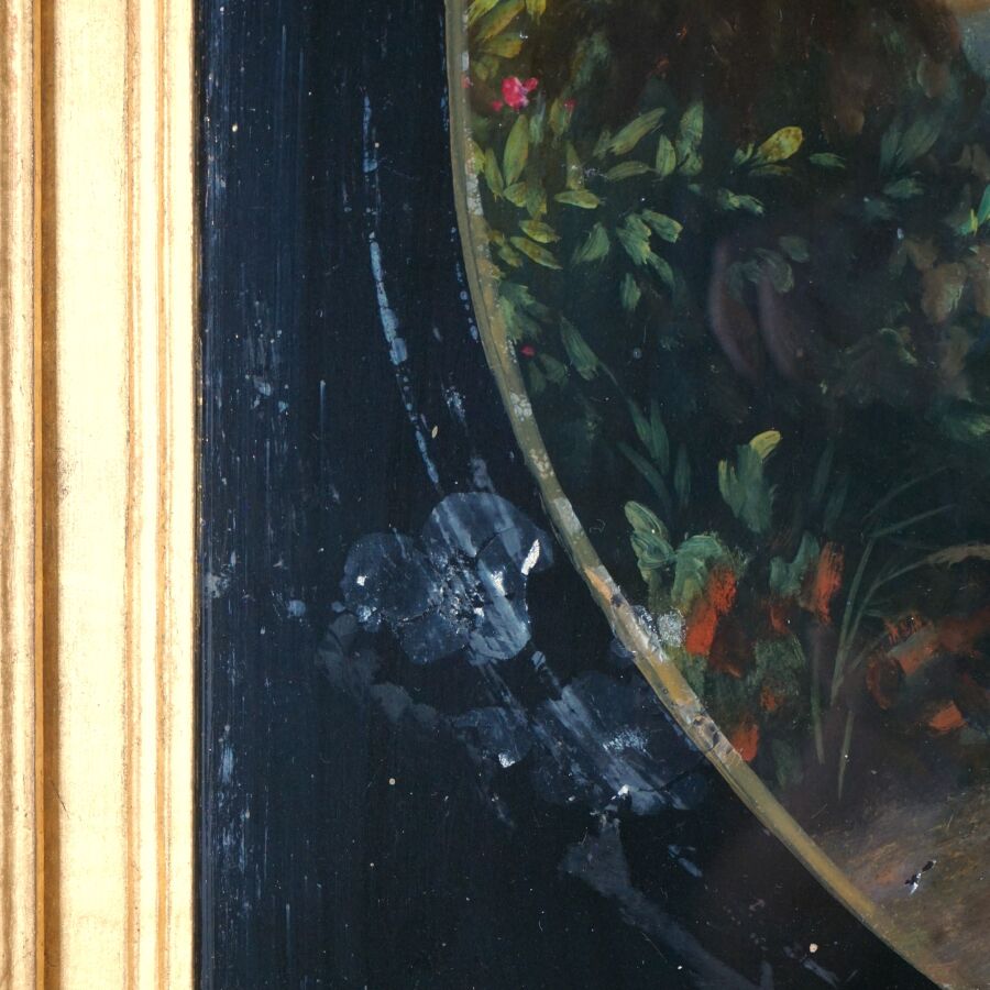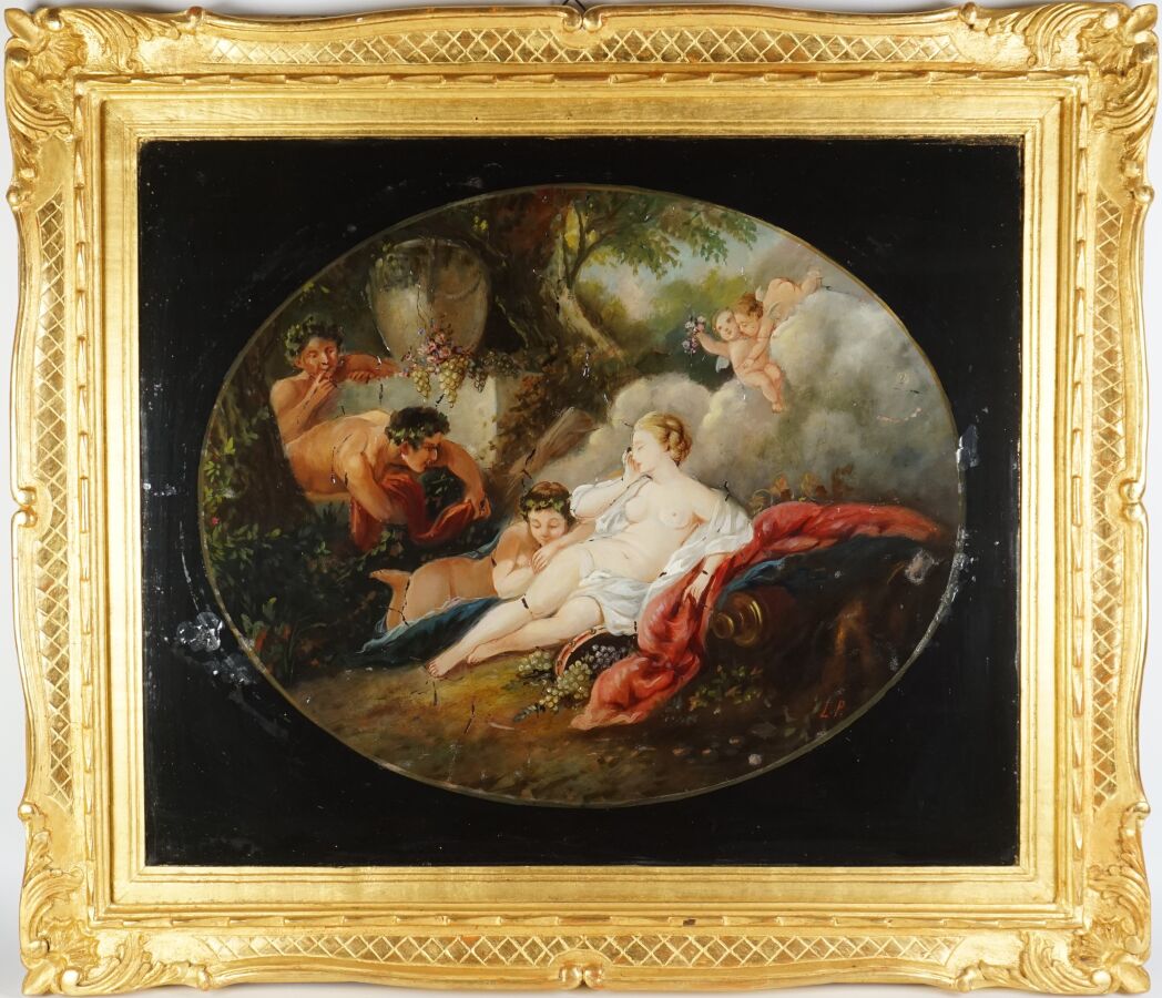 École du 19ème siècle, "Scène à l'antique", peinture sur verre en format médaillon, dans le goût du 18ème siècle, 53 x 63 cm (accidents et manques).