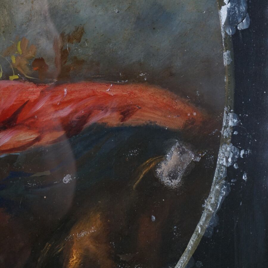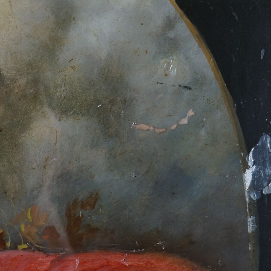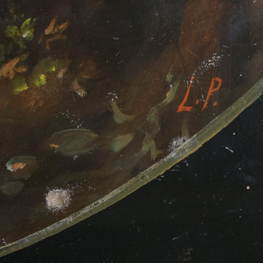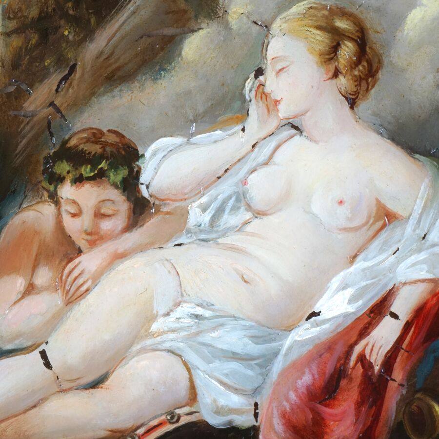 École du 19ème siècle, "Scène à l'antique", peinture sur verre en format médaillon, dans le goût du 18ème siècle, 53 x 63 cm (accidents et manques).