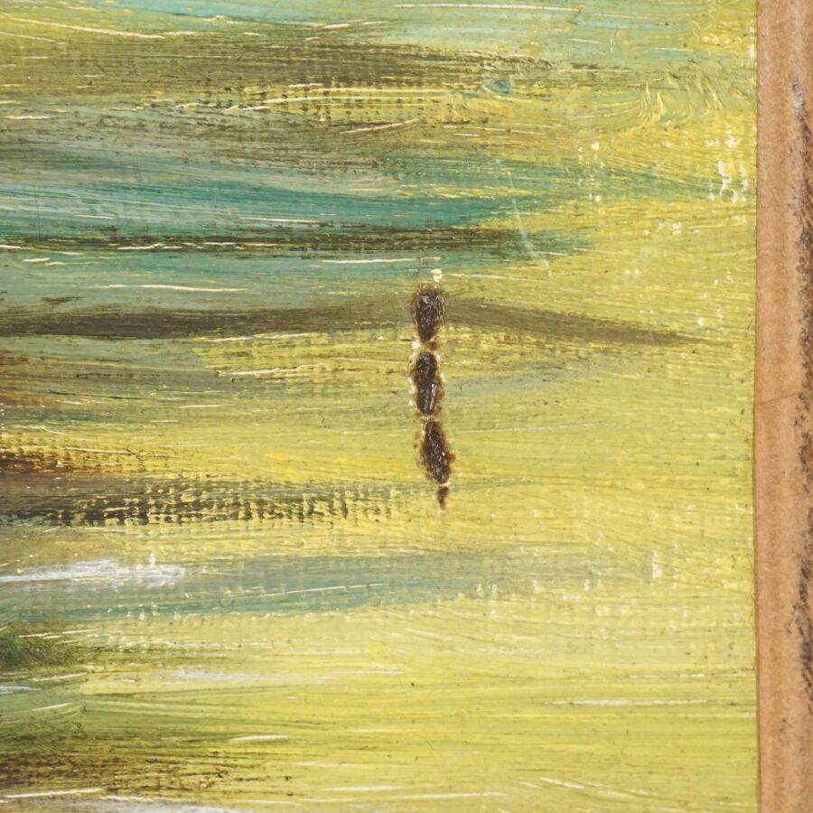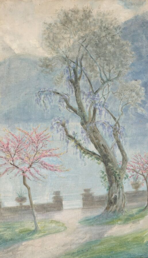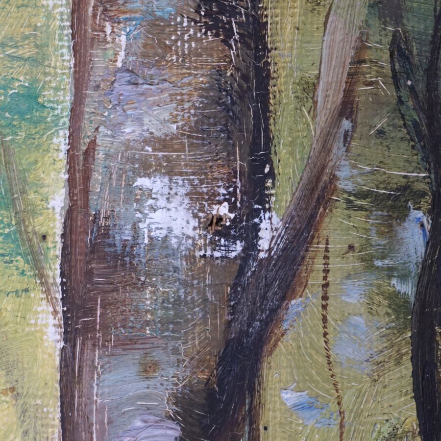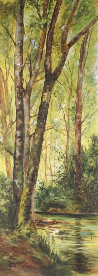 École du 20ème siècle, "Bouleau" et "Paysage arboré", deux huiles, sur toile et sur panneau, l'une portant une trace de signature en bas à gauche "G. Flaury (?)", 75 x 28 cm et 66 x 39.4 cm (restauration et petit trou à l'une).