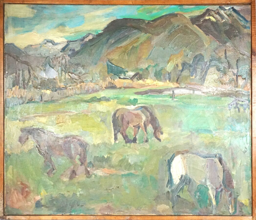 Ecole du 20ème siècle, "Chevaux au pré", huile sur toile non signée, 60 x 70 cm (petites restaurations).