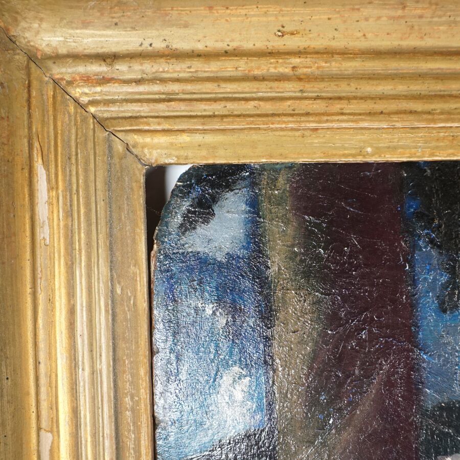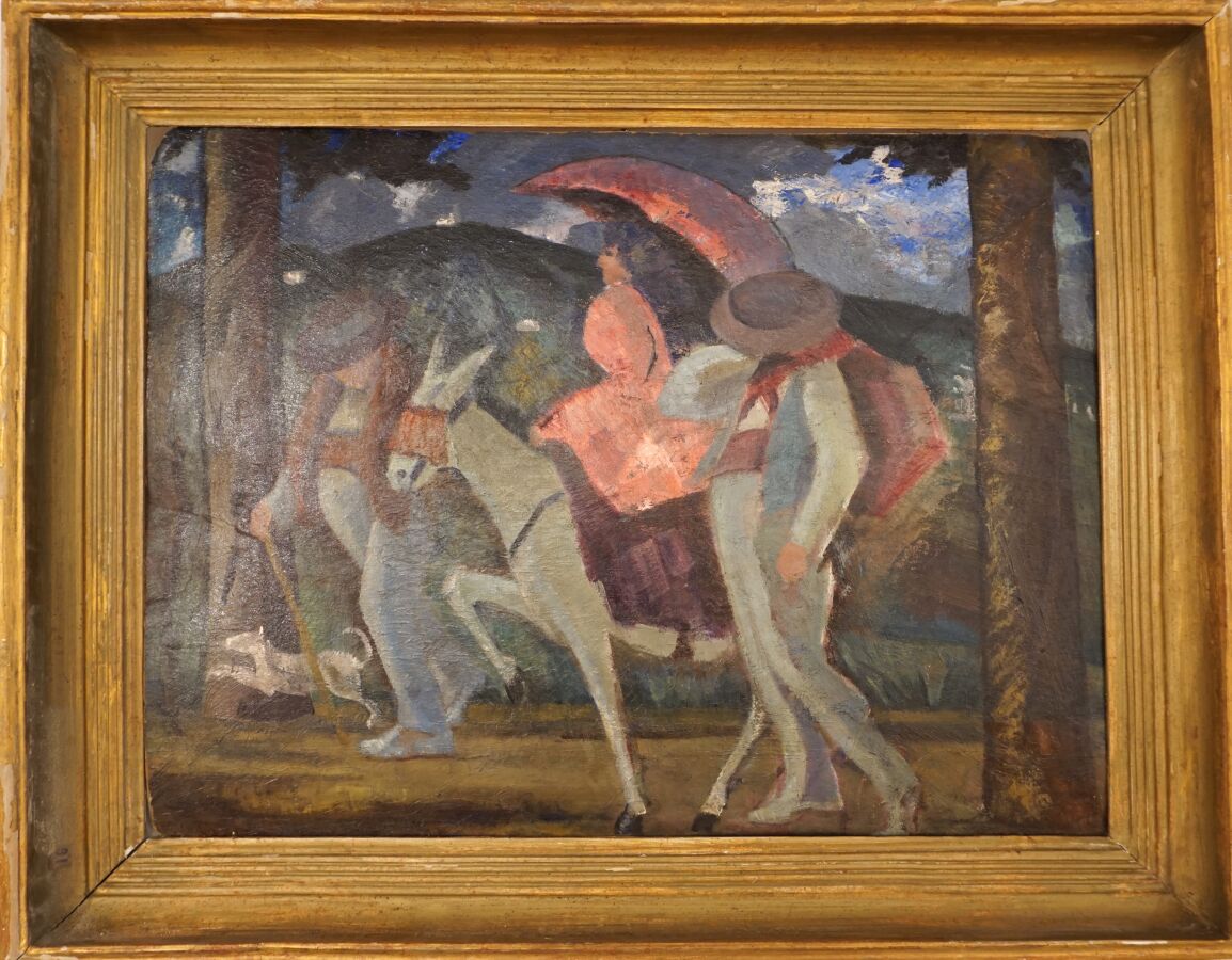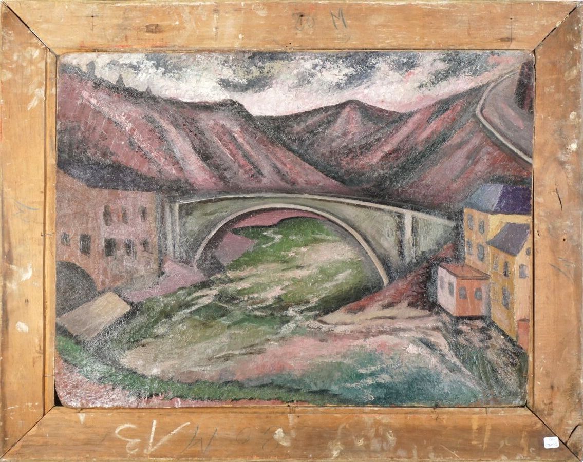 École du 20ème siècle, "Femme à l'ombrelle", huile sur carton non signée à décor au revers d'un "Paysage au pont", 53.5 x 71.2 cm (sauts au cadre, usures aux angles).