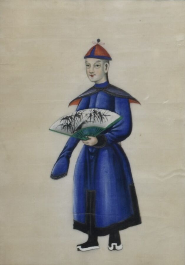 École du 20eme siècle, "Mandarin et courtisane à l'éventail", ensemble de deux gouaches sur papier de riz, montées sur soie, encadrées, 21 x 15 cm. (usures)