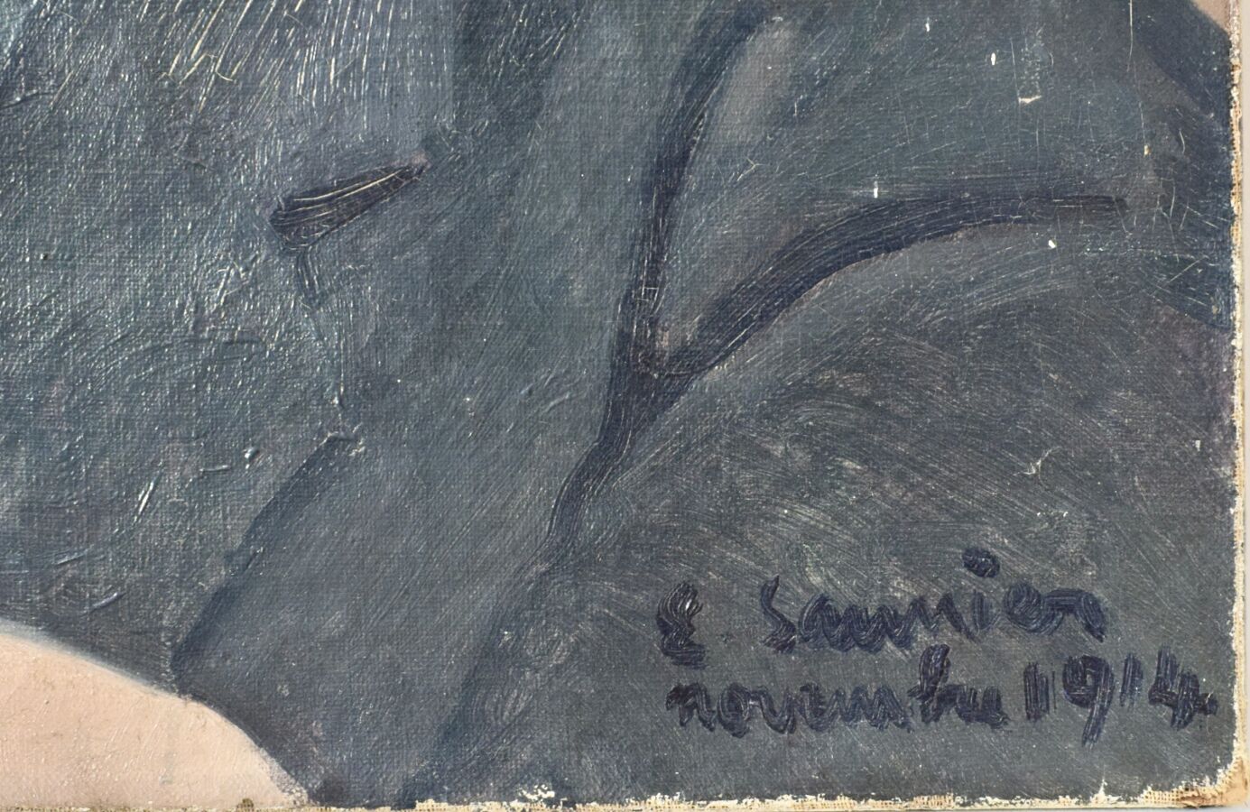 Ecole du 20ème siècle, "Portrait présumé d'Edouard SAUNIER (1885-1918)" 1914, huile sur toile, annoté en bas à gauche, cachet d'atelier au dos, 46 x 38.5 cm.