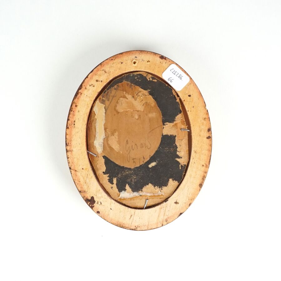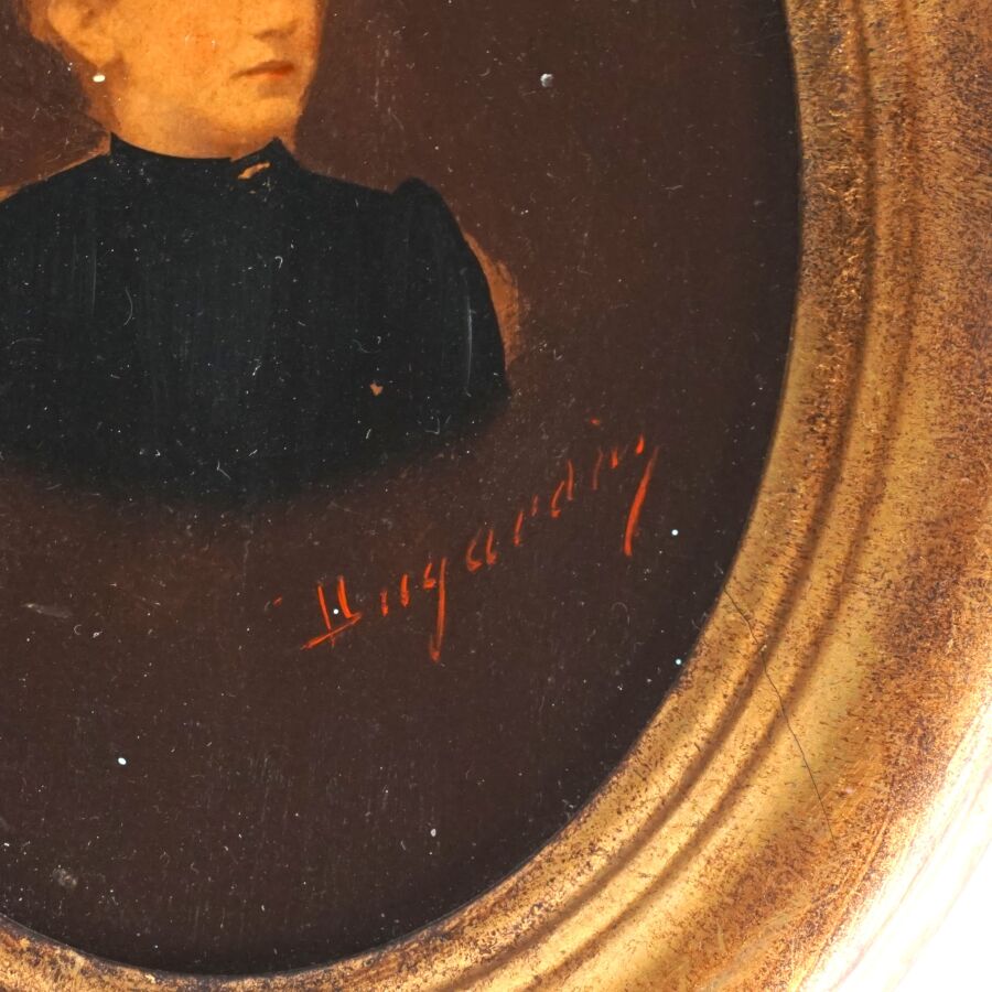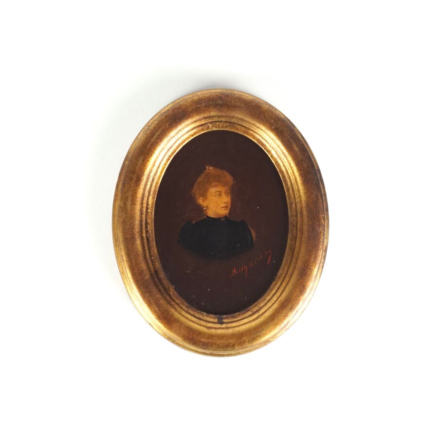 École du début du 20ème siècle, "Portrait de femme au chignon", huile sur panneau, signée "Bugardin (?)" en bas à droite, 10.5 x 7.7 cm (usures).