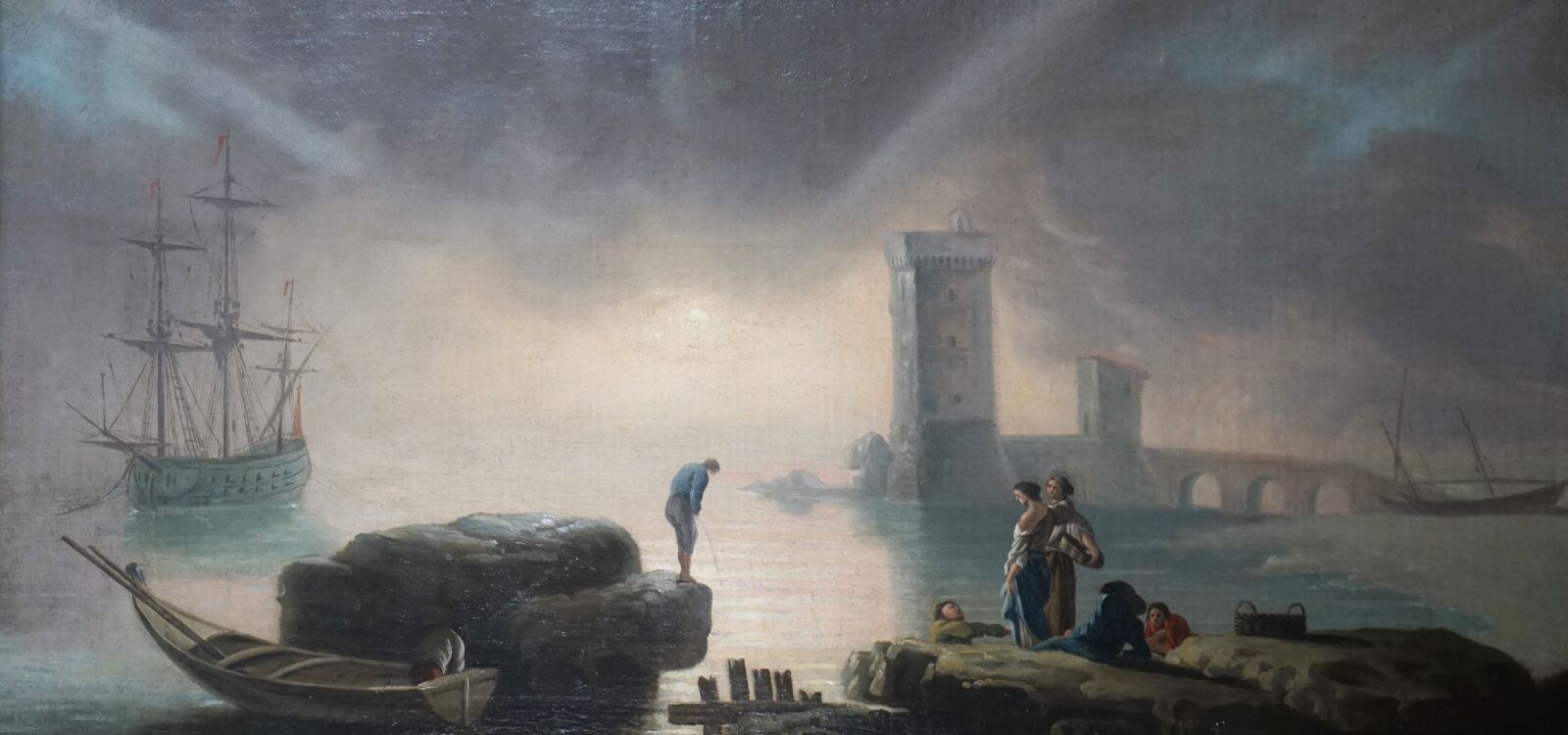 École du nord du 19ème siècle, "Sur le port", huile sur toile non signée, 48 x 98.5 cm (restaurations).