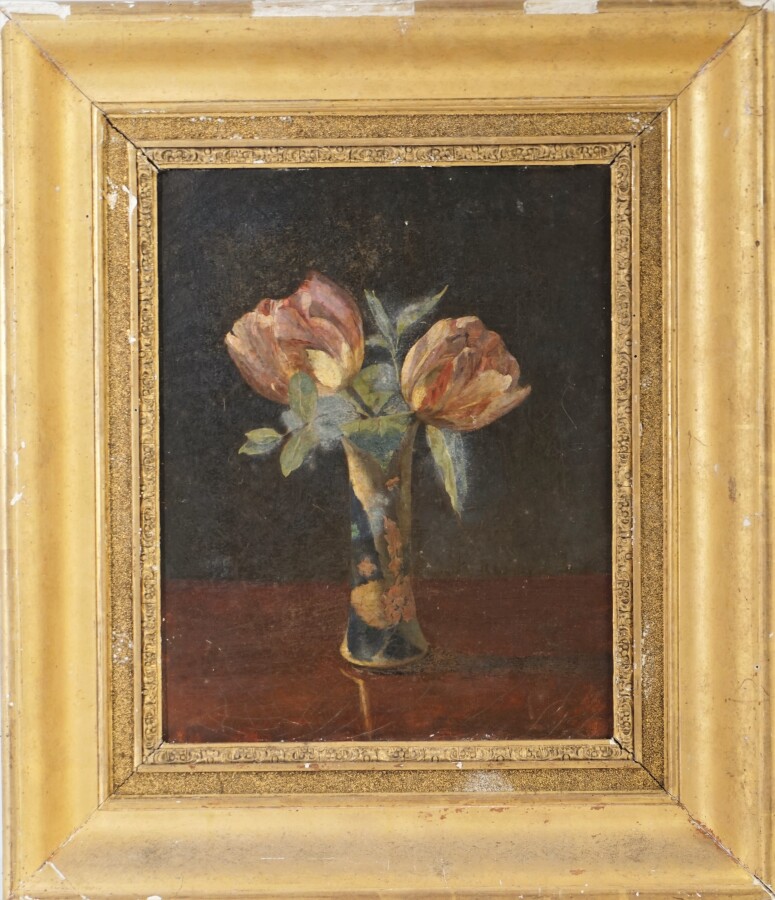 Ecole française de la fin du 19e - début 20e siècle, "Nature morte aux roses" et "Pivoines dans un vase art nouveau", deux huiles sur toiles non signées, 21.5 x 27 cm (en l'état).