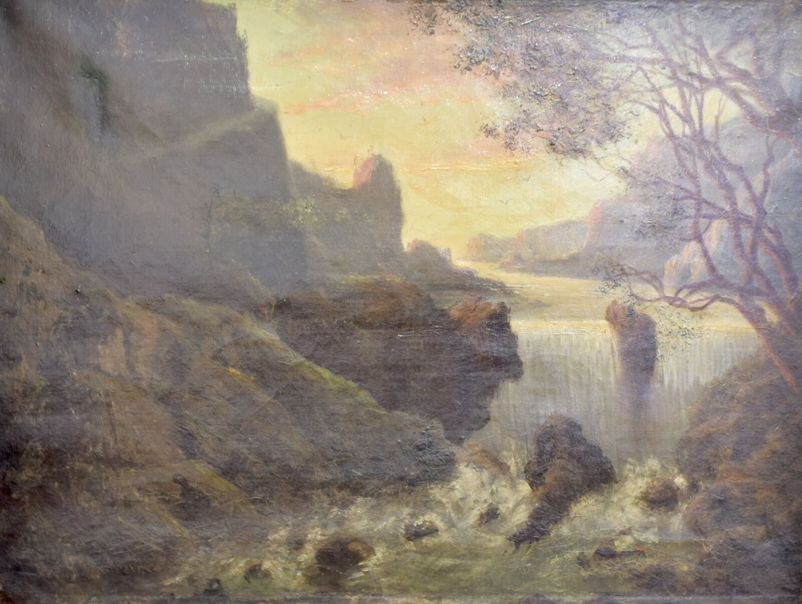 École française de la fin du 19e siècle, "Cascade", huile sur toile, 46 x 61 cm (manques et voilage important).