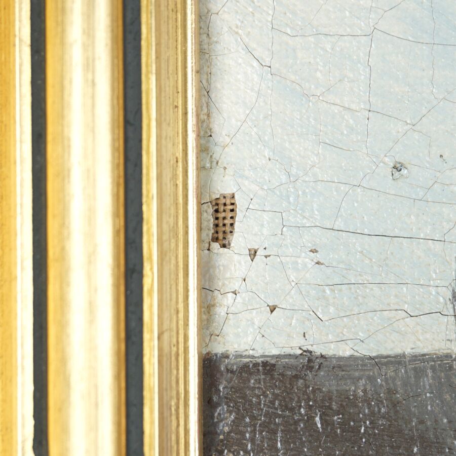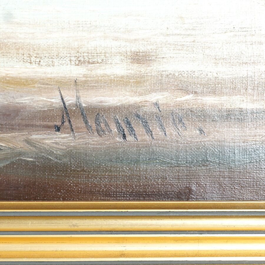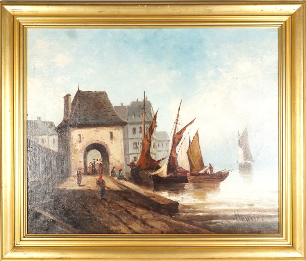École française de la fin du 19ème siècle, "Bateaux à quai", huile sur toile, signature illisible en bas à droite, 46 x 55 cm (restaurations, manque).