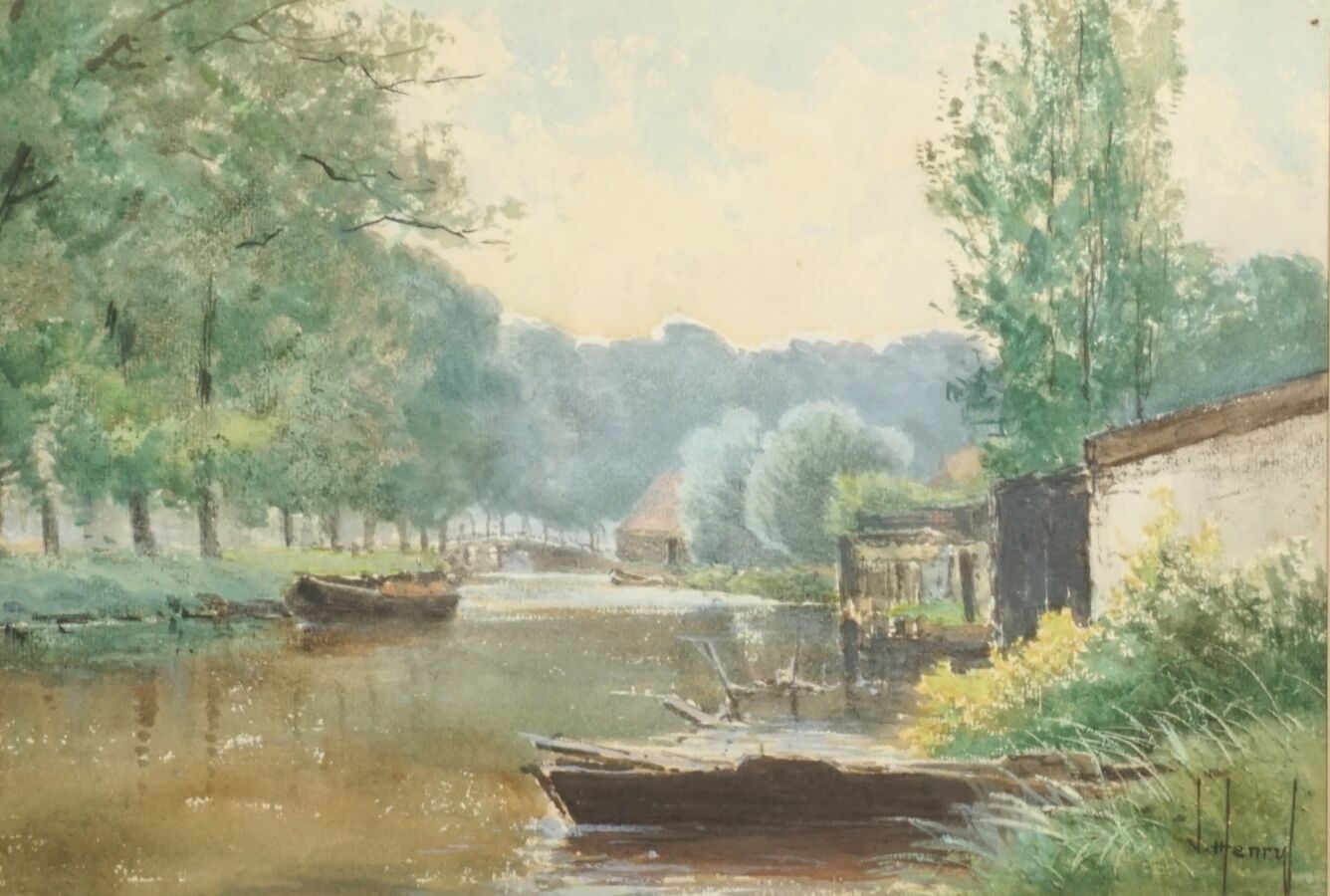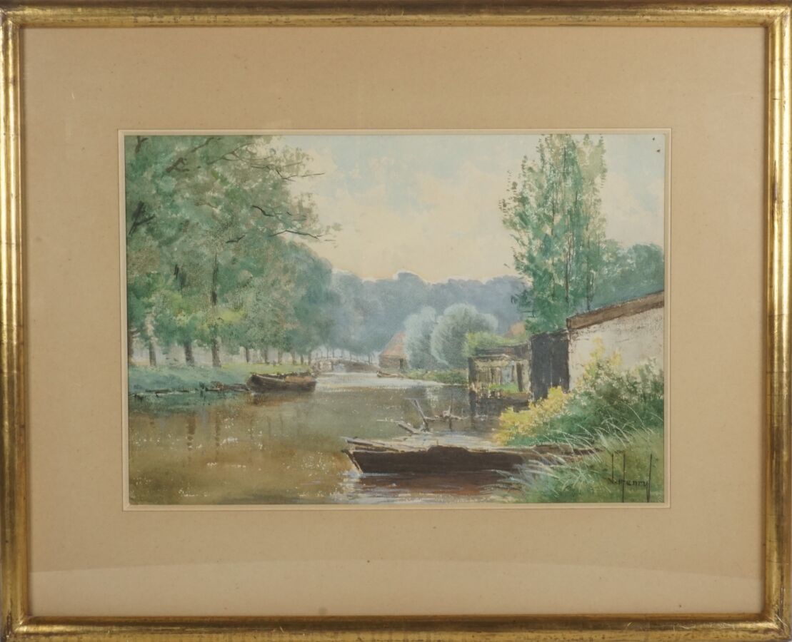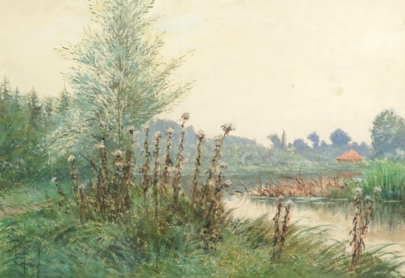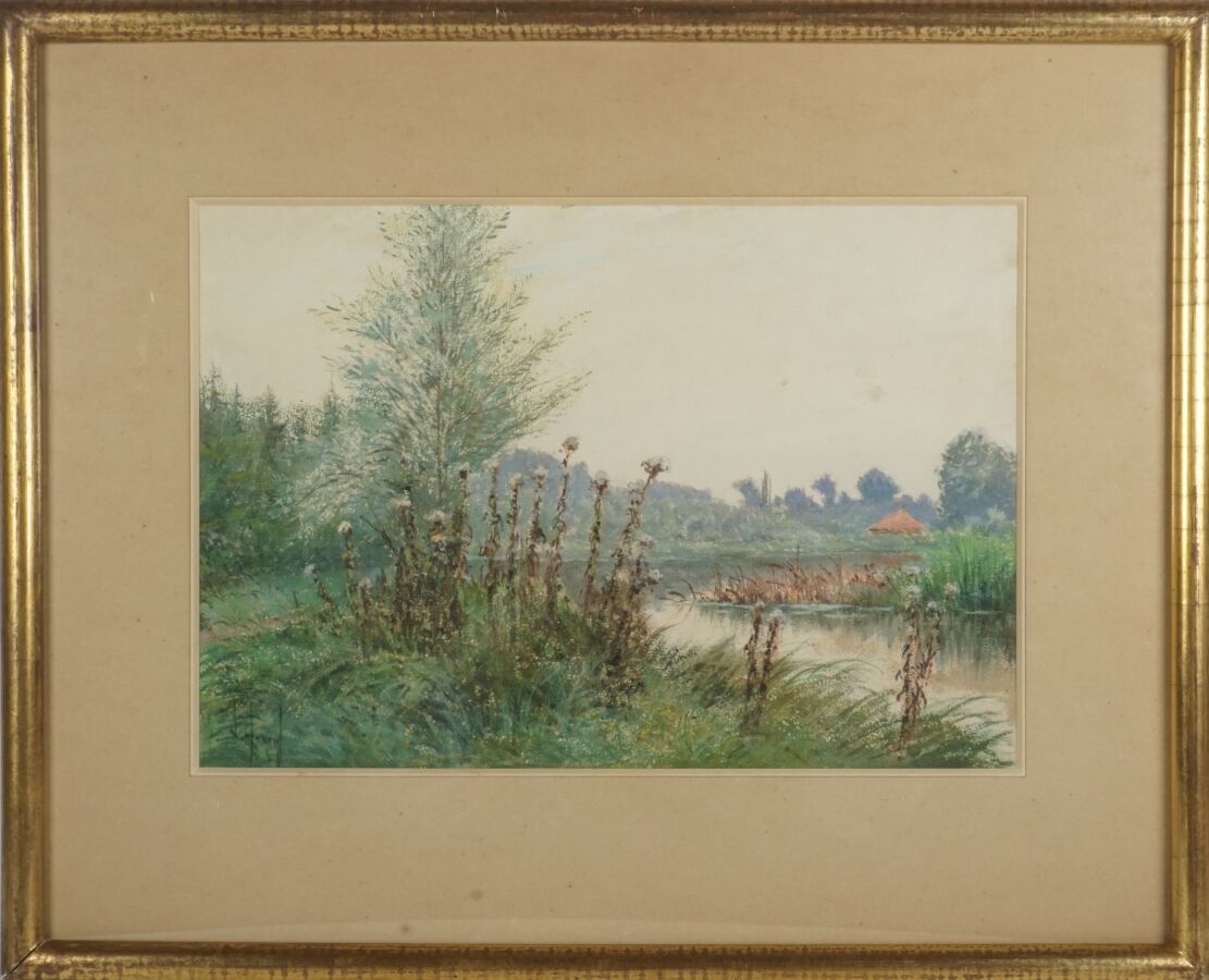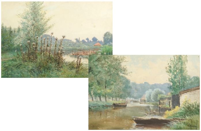 École française de la fin du 19ème siècle, "Paysage lacustre" et "Bords de rivière", deux aquarelles sur papier signées en bas formant pendant, 25.5 x 36.5 cm (à vue) (petits trous de punaise aux coins).