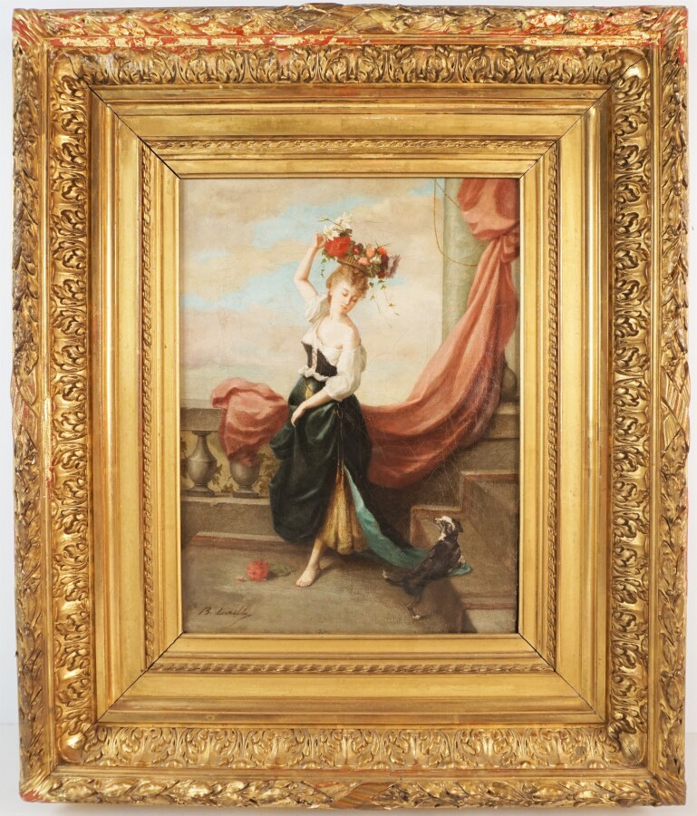 Ecole française de la première moitié du 19ème siècle, "Jeune femme au panier de fleurs", huile sur toile, trace de signature en bas à gauche, 32 x 24.5 cm.