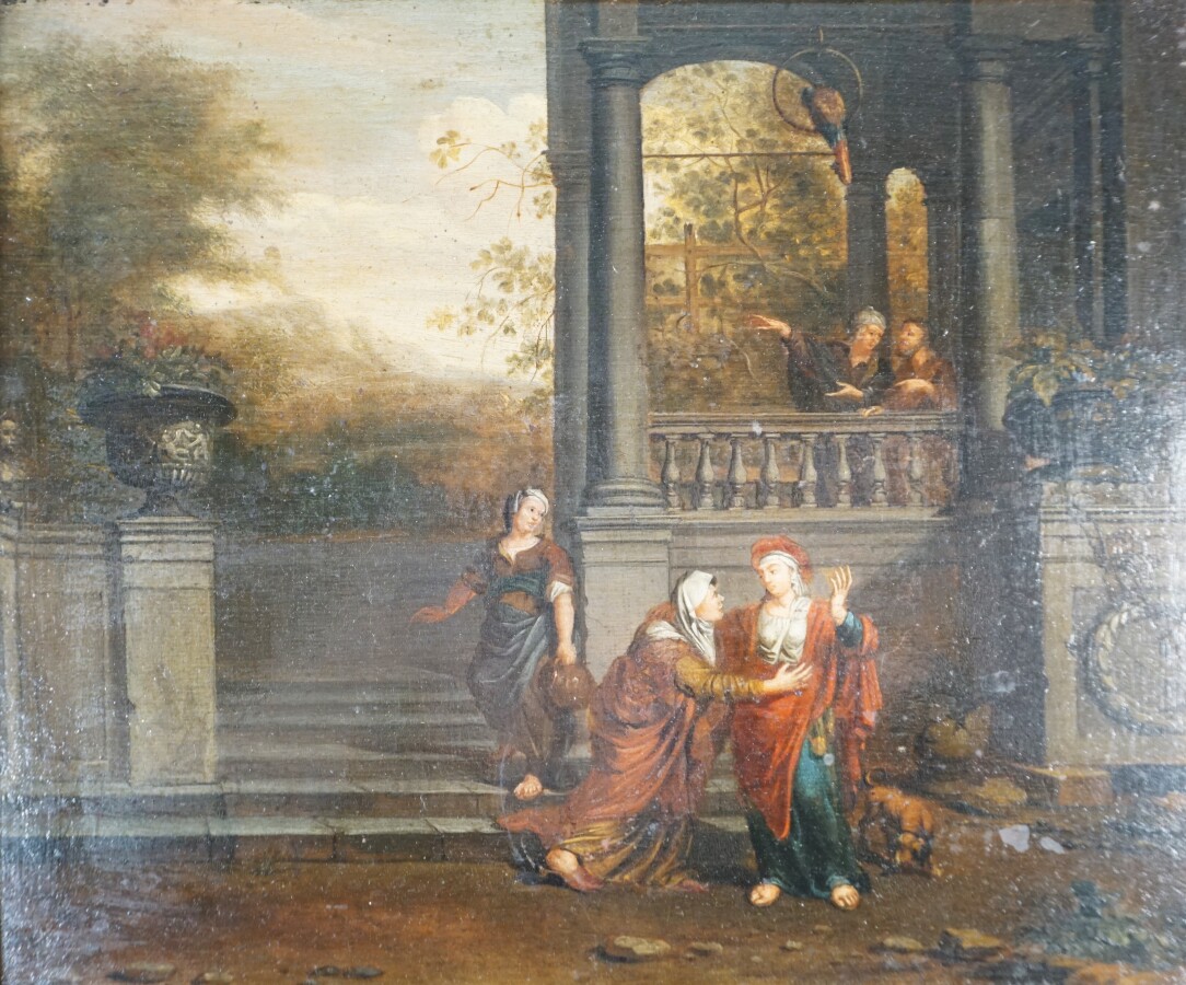 Ecole française de la première moitié du 19ème siècle, "Temples antiques animés", deux huiles sur panneaux formant un pendant, non signées, 27.5 x 32.5 cm (manques au cadre, petites usures).