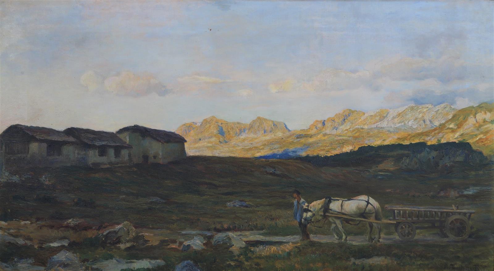 Ecole française de la seconde moitié du 19e siècle, "Paysan guidant son cheval attelé dans un paysage montagneux" 1863 (?), huile sur toile signée et datée en bas à droite, signature difficilement lisible "A. F... TI", 54 x 99 cm.