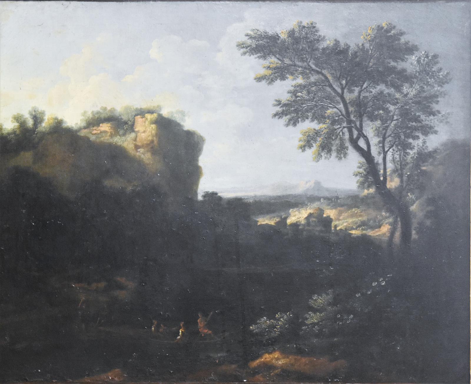 Ecole française du 18e siècle, "Paysage animé", huile sur toile, 49 x 61 cm (rentoilé et craquelures).