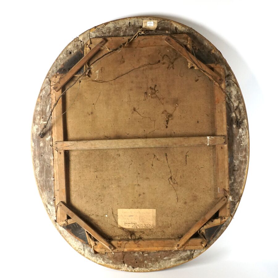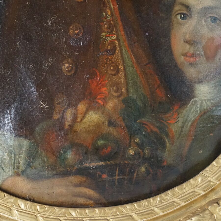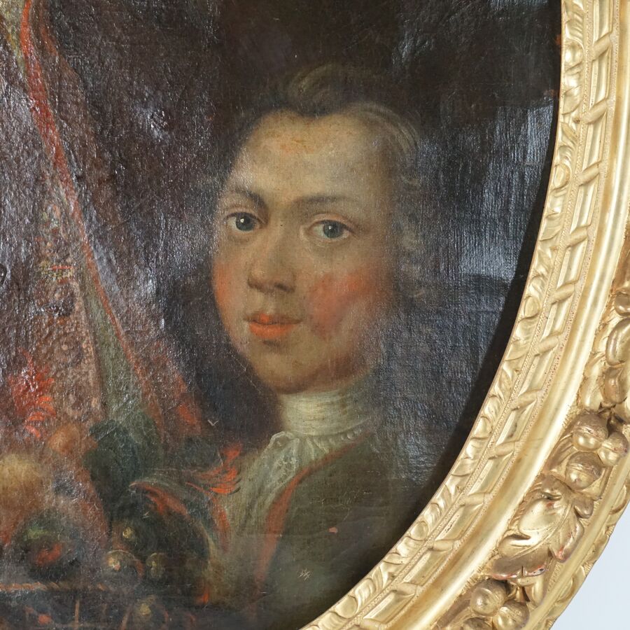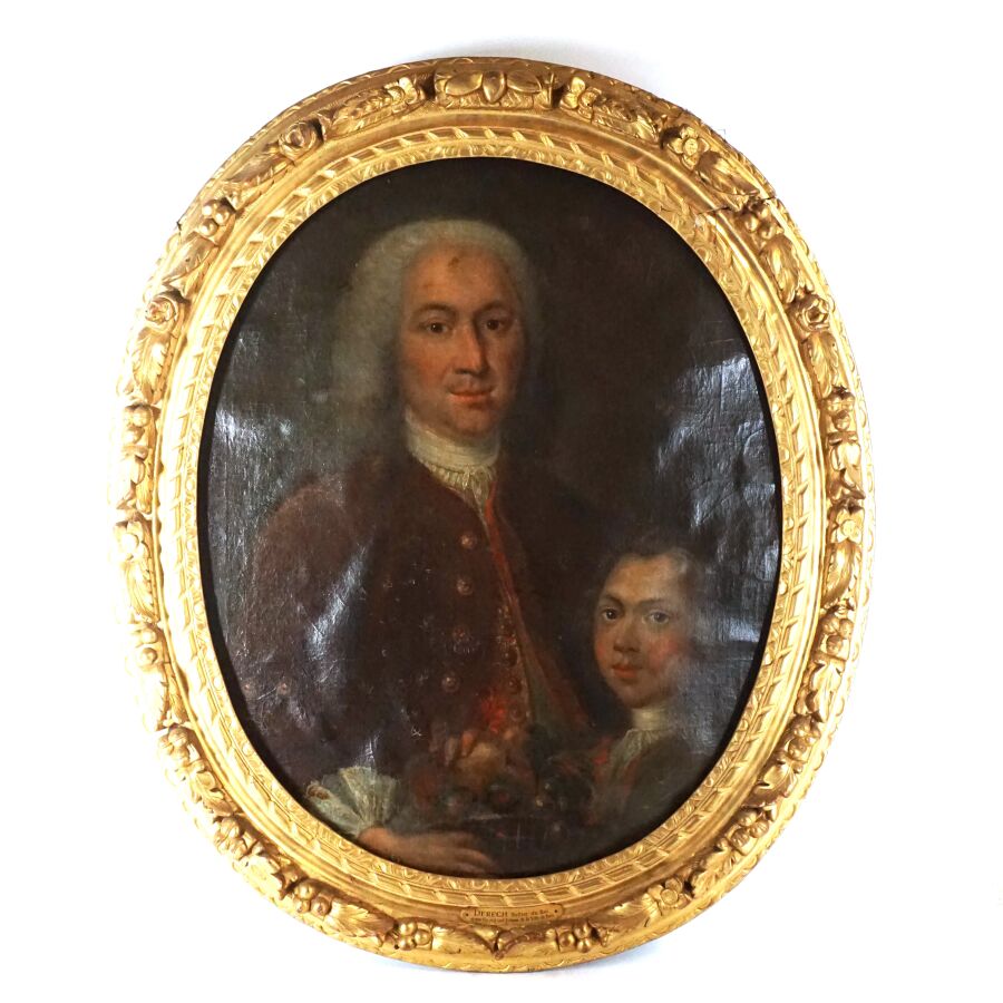 Ecole française du 18ème siècle, "Portrait de Derech, sellier du roi, et son fils", huile sur toile non signée, format ovale, Dim. 75 x 60.5 cm (craquelures et usures).