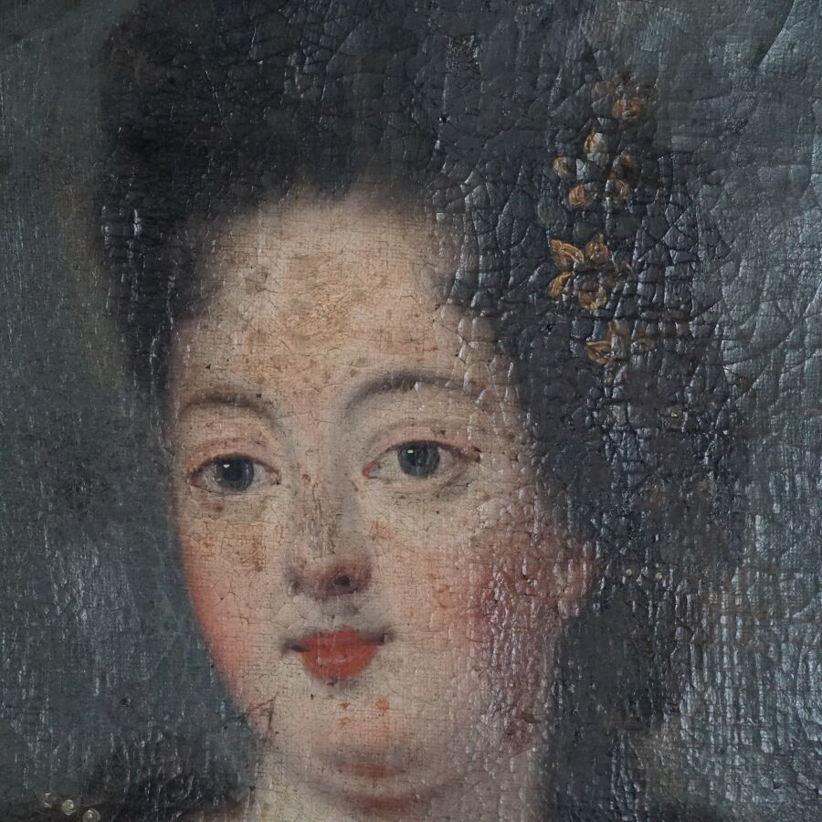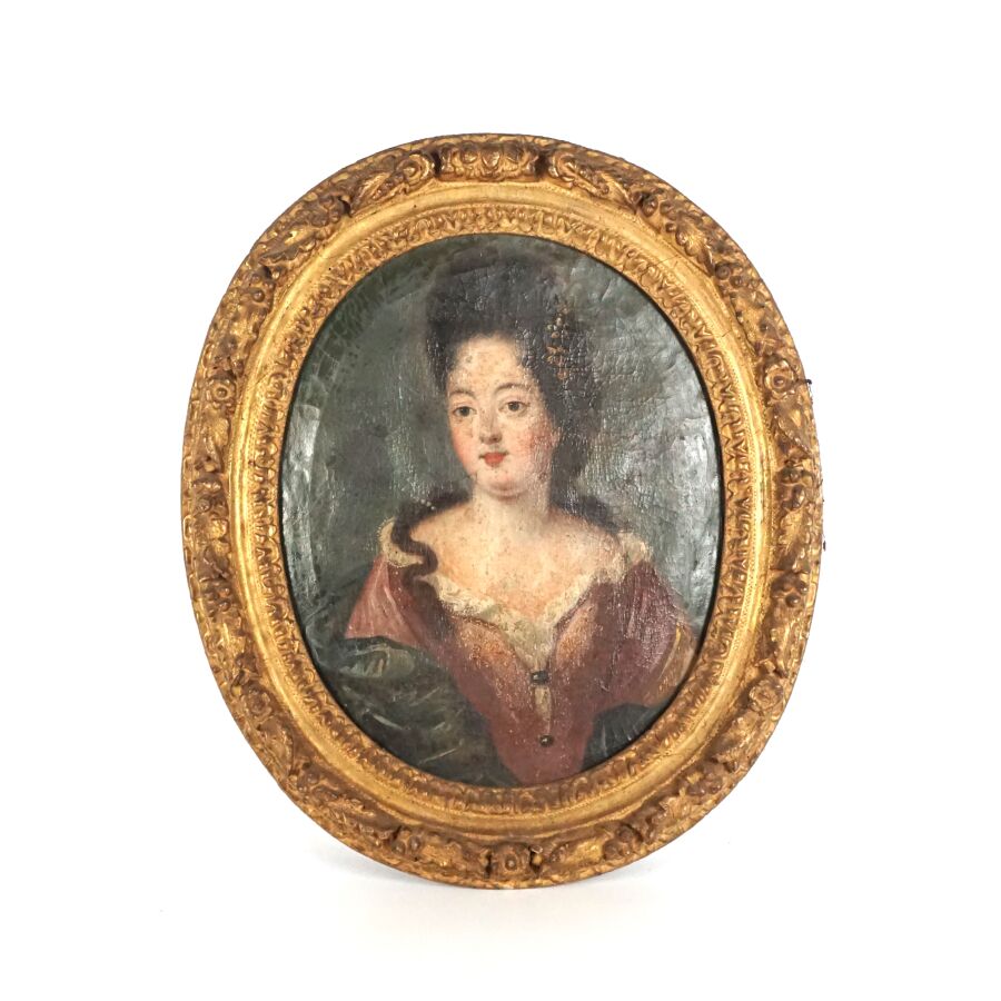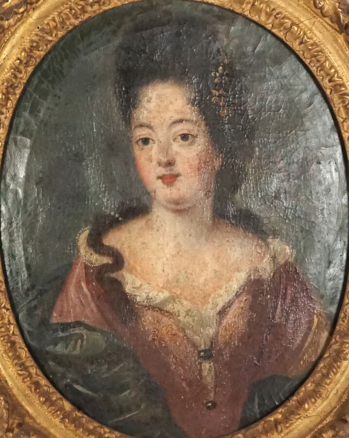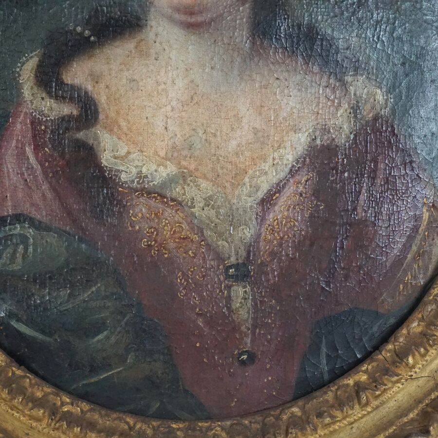 Ecole française du 18ème siècle, "Portrait de femme en buste", huile sur toile non signée, format ovale, 42.5 x 34.5 cm (craquelures et petits manques).
