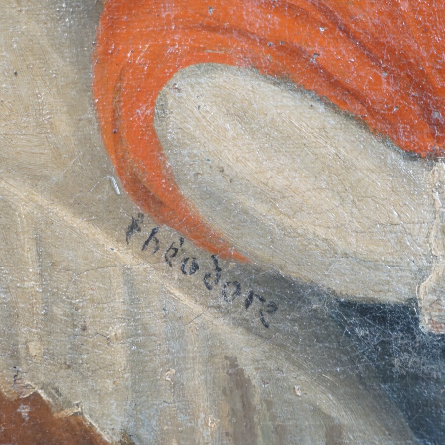 Ecole française du 18ème siècle, "Portrait du Comte de Malzac des Sengla, officier des Gardes du corps" et "Portrait de la Comtesse et son enfant", huile sur toile, l'une marquée "Théodore" en bas à gauche et portant les couronne comtale en haut, 60.5 x 49 cm (usures, craquelures, manques au cadre).