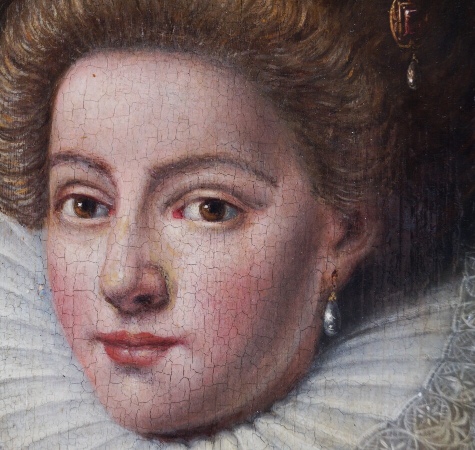 Ecole française du 19e siècle, dans le goût de VAN RAVENSTEIN (XVIIe), "Portrait de femme de qualité à la collerette et au médaillon", huile sur panneau, étiquette ancienne 1580/1657, 23.7 x 31.5 cm. (restaurations). Avec une facture de salle des ventes de Bordeaux).