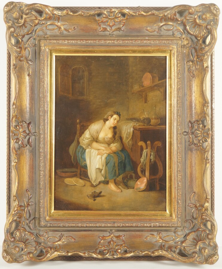 Ecole française du 19e siècle, "Femme dans un intérieur", huile sur cuivre, 30 x 22.5 cm.