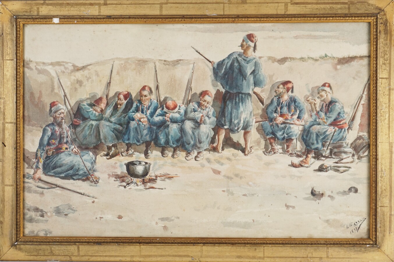 Ecole française du 19e siècle, "La pause des soldats, Afrique du Nord" 1893, aquarelle sur papier, porte une signature et datée en bas à droite, 50 x 31 cm (manques au cadre).